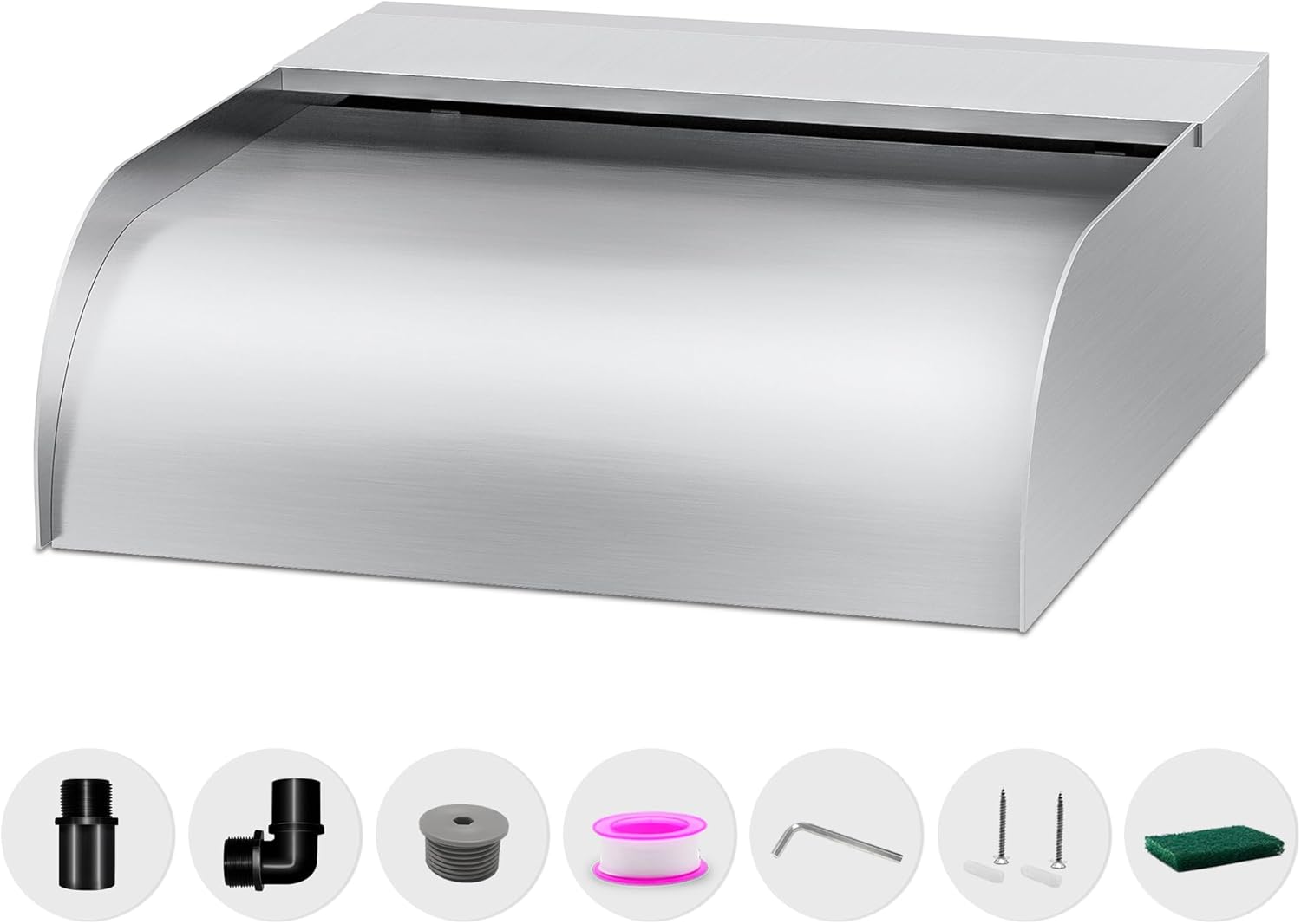 - 【Anti-Rust Spillway Waterfall】- Our welded in one body one-piece 304 stainless steel construction of this spillway waterfall provides long-lasting strength, rust resistance, and leakproof performance. The open lip design creates an elegant freefalling waterfall that adds decorative flair to ponds and pools. The soothing sound of the cascading water promotes relaxation and tranquility. LED light strips not included, but available separately.