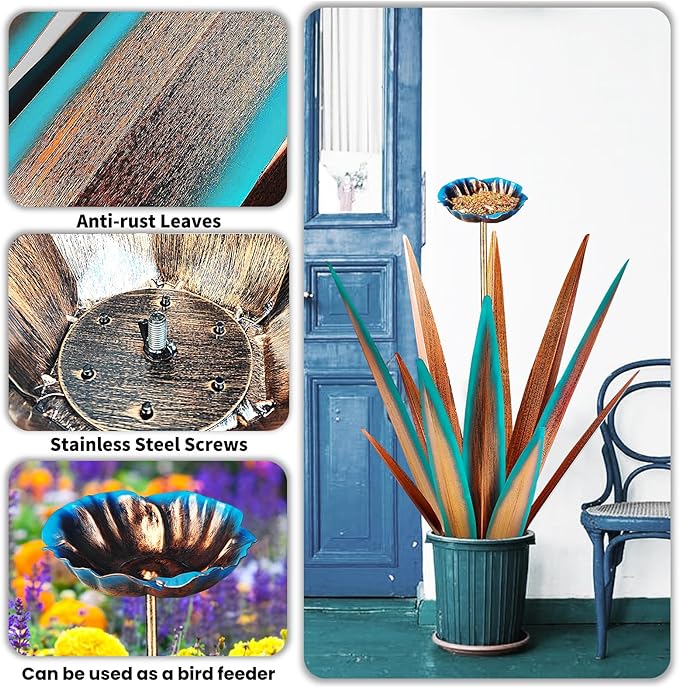 Large Tequila Rustic Sculpture, Rustic Metal Agave Plants for Outdoor, Home Decor Garden Yard Statue (Blue - L (W/Bird Feeder))
