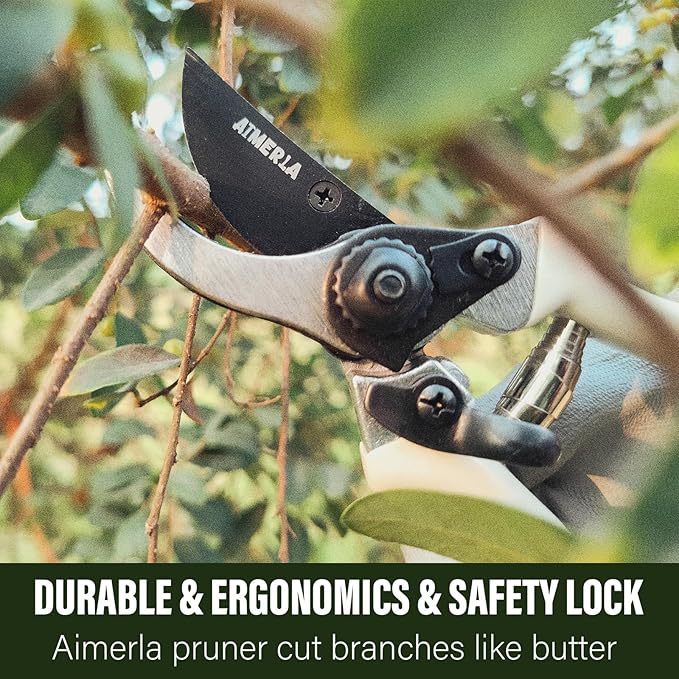 - ERGONOMIC HANDLE, NON-SLIP RUBBER: Featuring 7 different gardening tools with hand trowel, transplant trowel, garden rake, garden fork, weeder, weeding knive and pruner, this set from Aimerla is a Green team for anyone who wants to stock up on ergonomic hand tools with soft silicone handle covers for a firm non-slip grip. The materials is weatherproof and at the correct length for better leverage. Integrated hang hole makes for simple storage. This is THE perfect gift for DIE HARD GARDEN LOVERS!