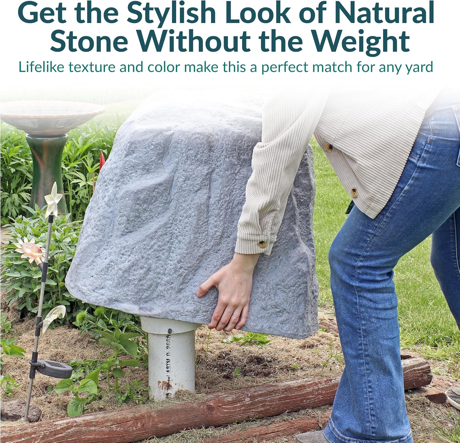 - CONCEALS LANDSCAPE UTILITIES: Place this set of 2 fake rock covers over a septic tank, well, sprinkler valve, pipe, or other unsightly objects in the yard. Push the stakes into the ground through the holes at the bottom of the rock to secure it over any object.