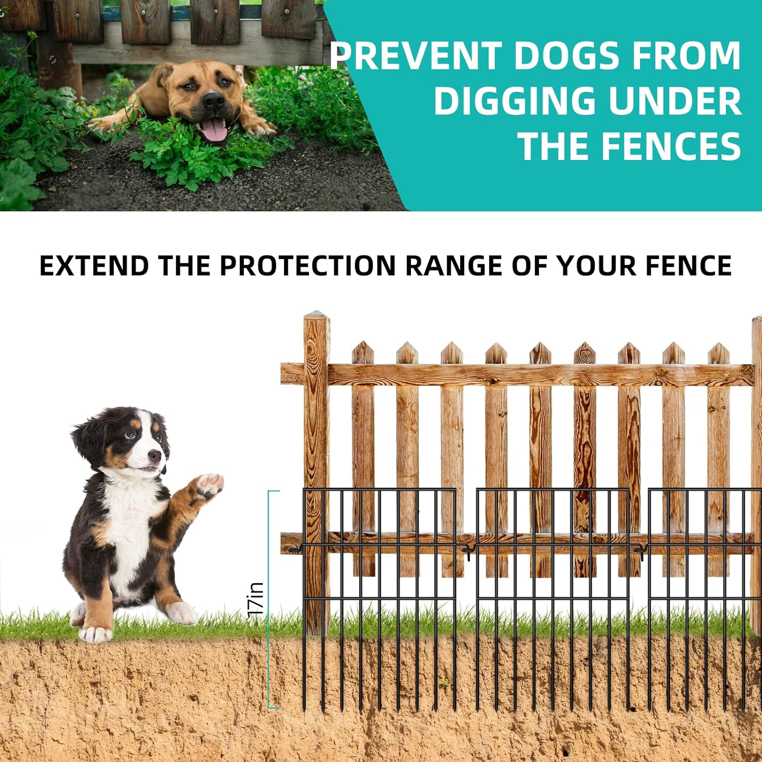 - GARDEN FENCE ANIMAL BARRIER - This dog fence barrier perfect for blocking gap at bottom of origin fence, extend your fence protection range, prevent your dogs from digging and escaping. The gap of each metal poles is 1.25in, prevent access and damage by small animals. NO MORE ESCAPES FOR YOUR DOGS, NO MORE VISITS FROM SMALL ANIMALS
