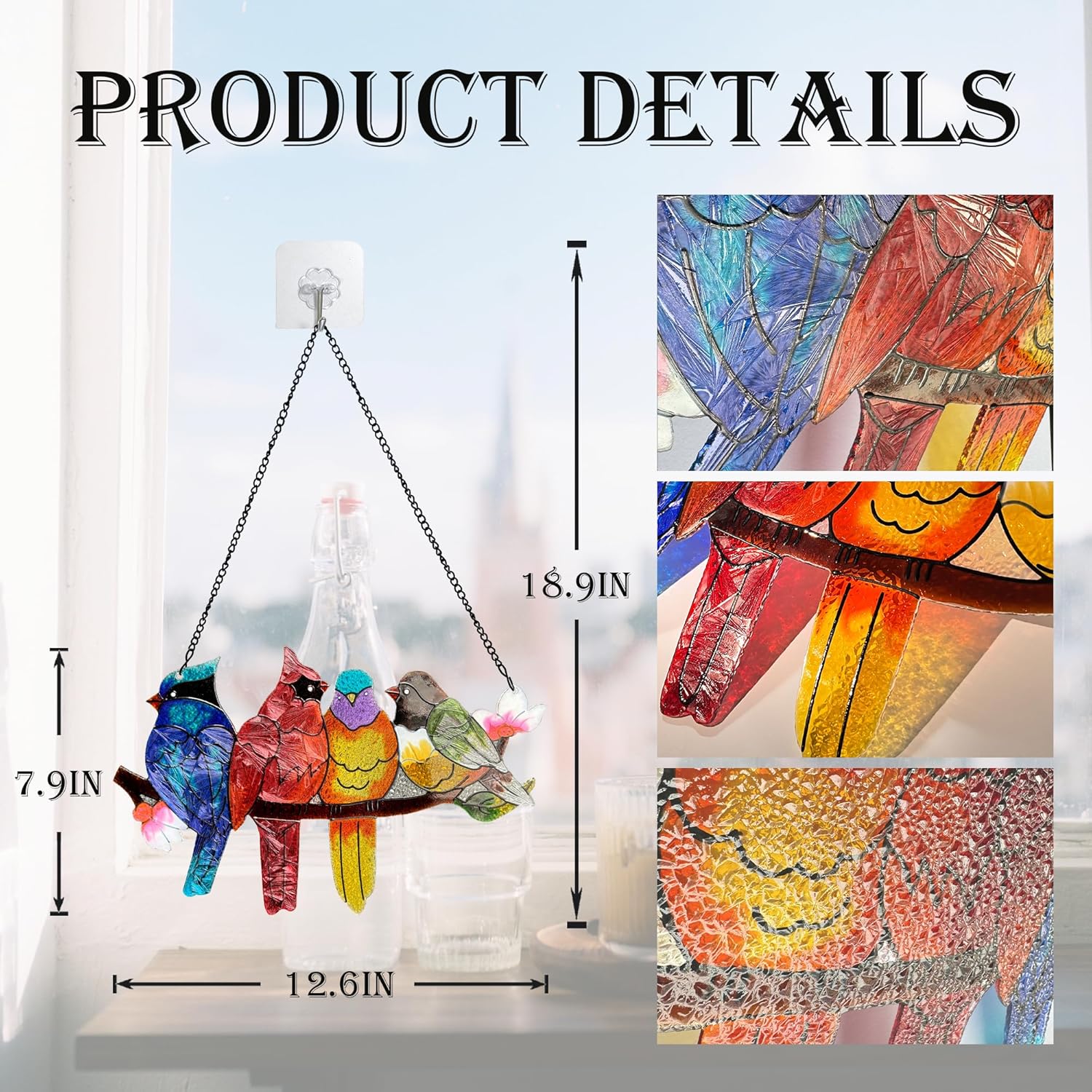 - Timeless Beauty and Elegance:Our stained glass window hanging colors are so vibrant & it's well made,There are different textures to the birds.Whether you're a bird lover or simply appreciate the beauty of stained glass. It adds a nice pop of color to the outdoor winter gloom you see through the windows.
