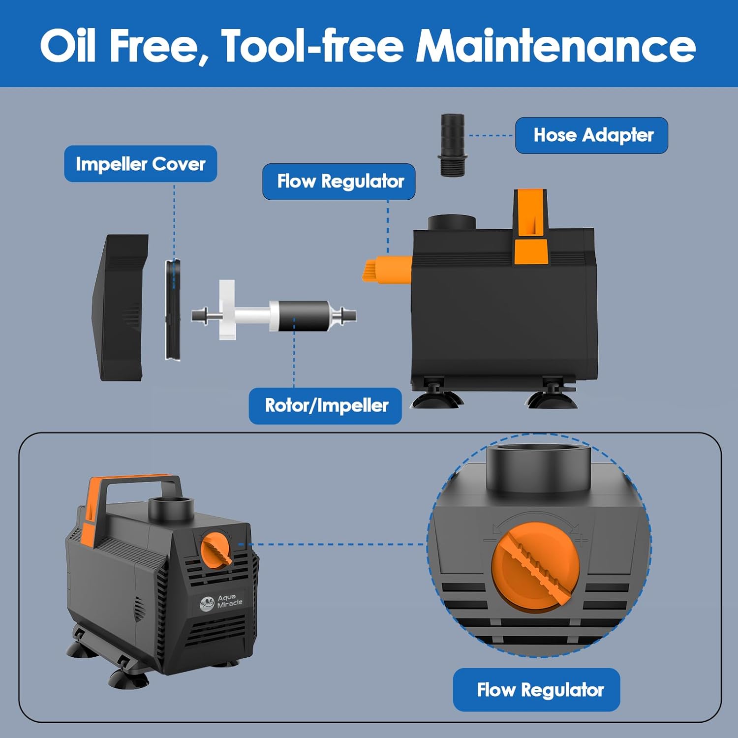 - CONVENIENT MAINTENANCE - Designed with a handle for portability, this fountain pump is user-friendly. Maintenance is hassle-free with no lubrication required and no special tools needed. Simply detach the front screen, rinse the components, and reassemble.