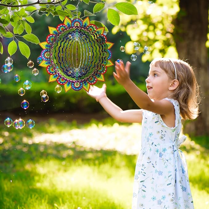 - 【Ambience Complementing & Gift Ideal】: The hanging wind spinners is absolutely beautiful. It spins well in the wind. It is cute and cheerful. It can also be hung in a quiet bedroom, on balcony, or in nature. Wind spinner is a beautiful, fun, zen-like addition for indoor and outdoor spaces. This is also a perfect gift idea for women or friends who love mandala art and yard art.