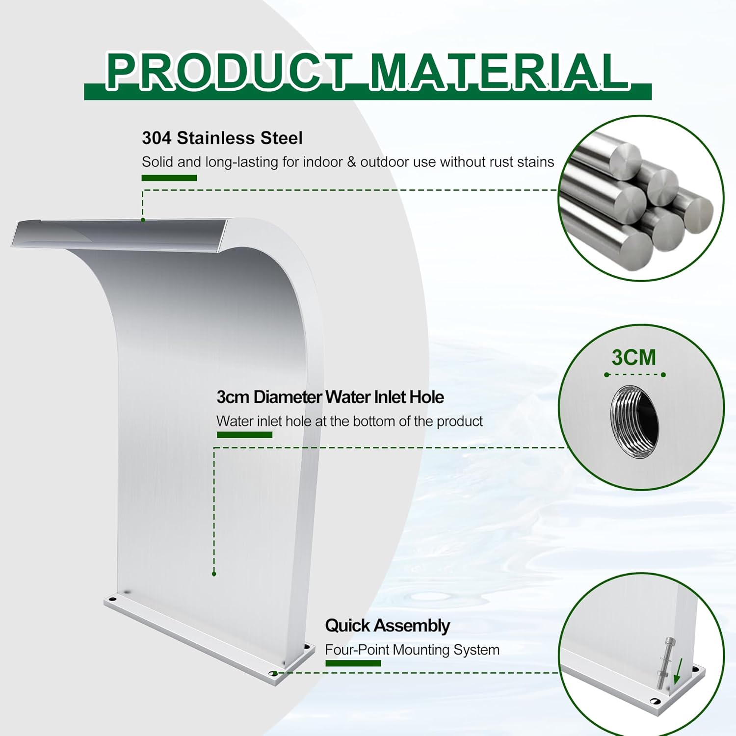 - One Year Replacement Committment: This elegant pool fountian requires a separately obtained pump for operation. We stand behind our products, and our dedicated support team is available to address inquiries regarding this product, offering prompt responses within a day. Please browse our other products for pool fountain accessories in our store. Waterfall only. LED light strips additional purchase.