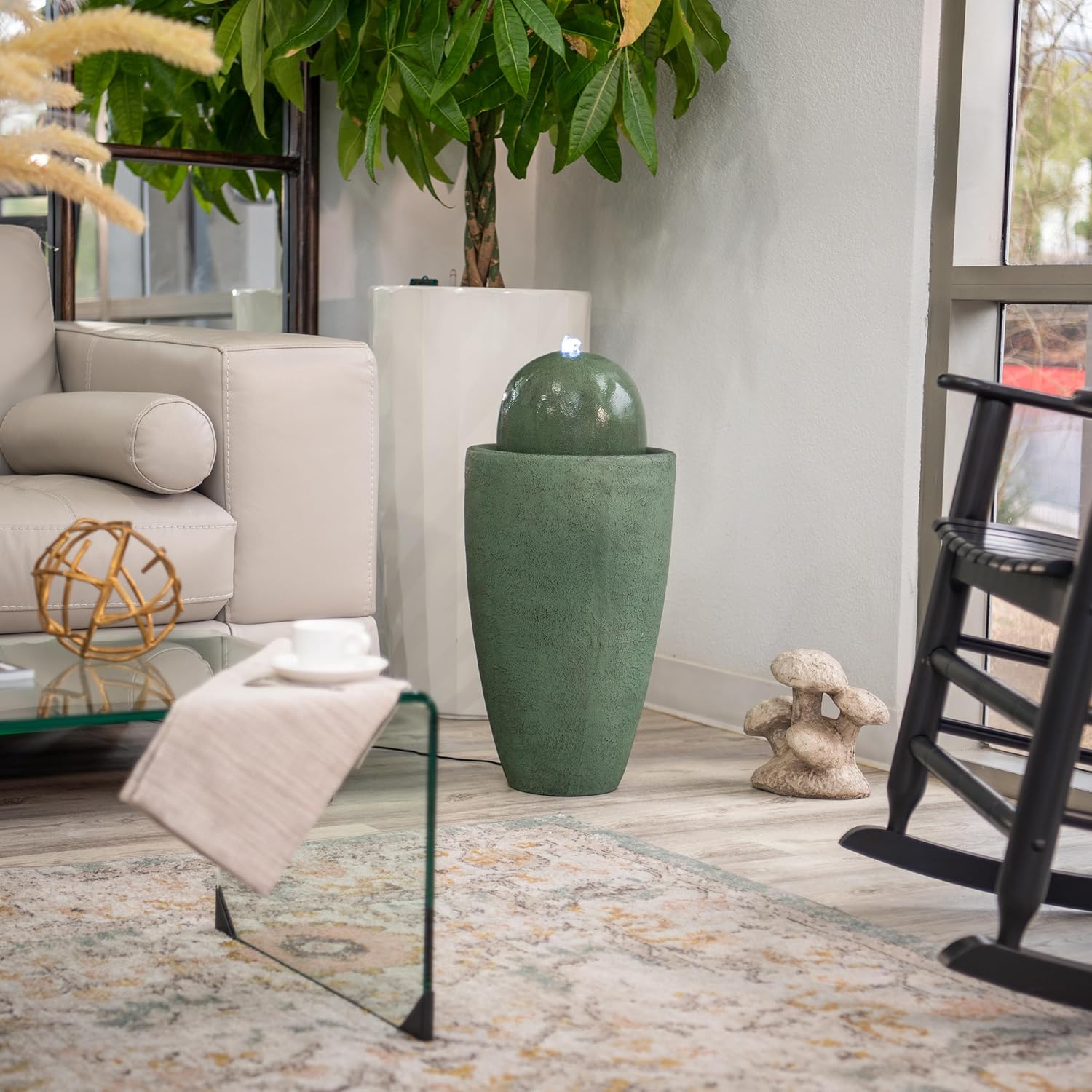 - GREAT SIZED AND LONG-LASTING: This ball water fountain decor measures 25.98"H x 11.81"L x 11.81"W, cord length 5 meters, made of durable Fiber Stone that ensures high quality for years. Also, water capacity of the fountain is 6.4 L.