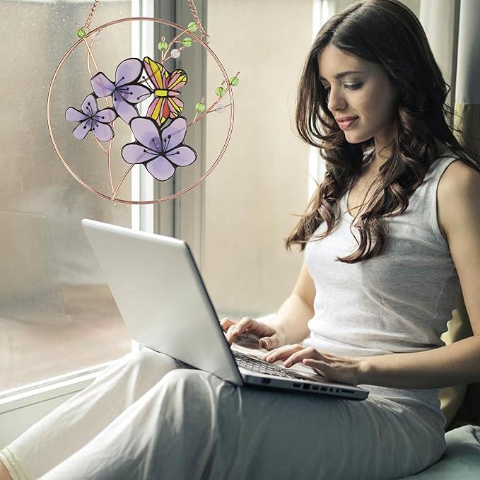 - Captivating Arrangement Design:This stain glass window hanging features exquisite details, with three small light purple flowers and vivid butterflies hanging from the metal frame. This suncatchers a wonderful decorations for walls, windows, doors, gardens, terraces, balconies, porch, courtyard.