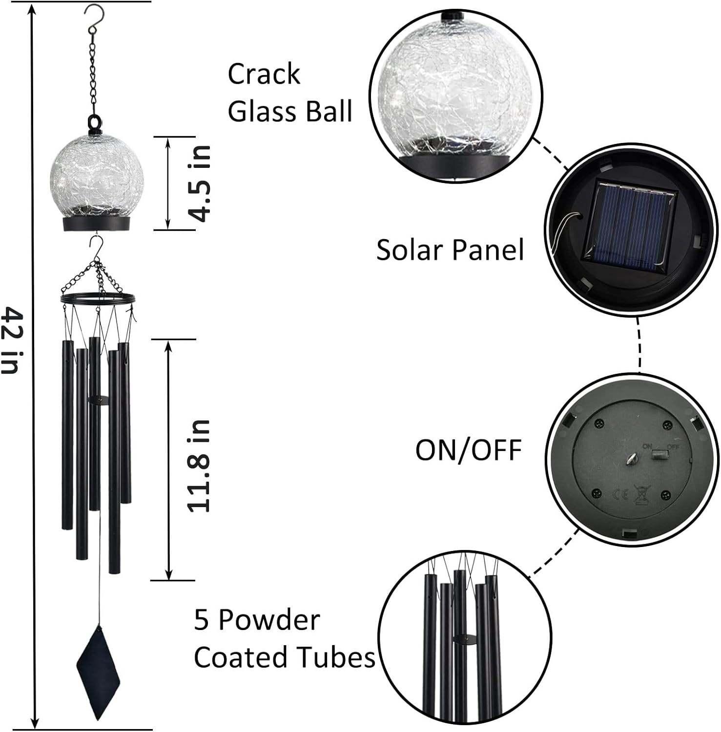 - 【Solar Powered Outdoor Lights】: The crackled glass ball of the solar wind chimes shines brightly in the sunlight. Solar lights can recharge under sunlight when switch to ''ON'' position. When the sun set, the copper wire LEDs automatically illuminate a warm white light with flickering effect.
