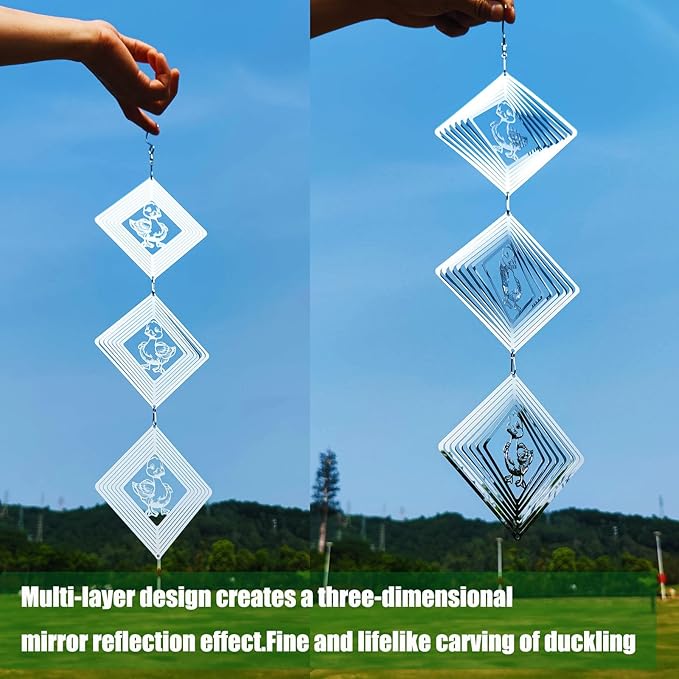 - These are 9 swivel hook and 9 ducks shape bird scare of very shiny reflective matel wind spinners can rotate easily in the breeze.Individual duck wind spinners are 9.25inch in length, you can connect them as long as you need.protect your garden, farm, and lawn by creating a bright flash that scares away birds.