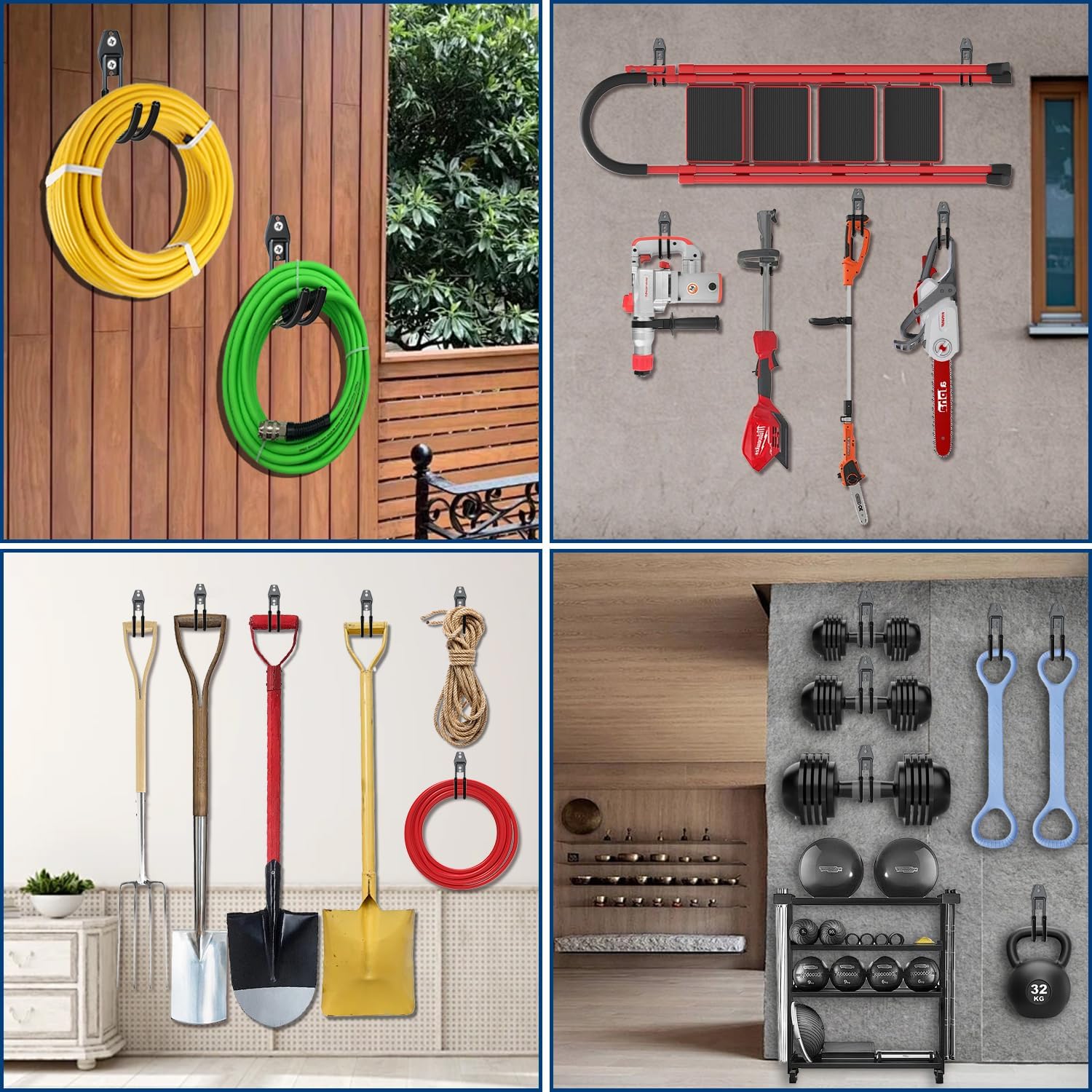 - Premium Quality Hose Hook: Our wall mount hose holder, featuring 3 reinforced welding spots, boasts a robust solid steel body that ensures exceptional sturdiness and durability. The garden hose hook’s dual arm design can securely hold heavy yard tools, supporting up to 70 lbs. Keep your hoses off the ground and free from tangles, crimps, and kinks with our garden hose hangers for outside