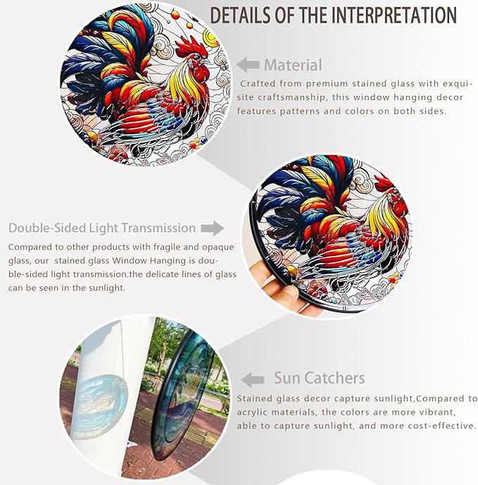- Thoughtful Exquisite Gift for Any Occasion: Our Rooster stained glass suncatchers make a heartfelt gift for friends, family, and loved ones. Whether you're celebrating Thanksgiving, Christmas, Valentine's Day, Easter, Mother's Day, or any other special occasion, this glass suncatcher adds a personal and meaningful touch to your gift-giving. Its exquisite craftsmanship and charming design ensure it will be cherished and admired by the recipient. Perfect for adding a touch of rustic elegance to any home, it's a gift that keeps on giving, bringing joy and beauty to the lives of those you care about