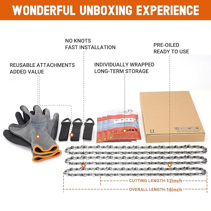 - 【Package Includes】: 3* Saw chain, 3* Storage bag, 1* Pair of gloves(XL/10), 3* Velcro. (Gloves can be used to replace the chain and isolate the lubricating oil on the surface, but not anti-cut!!!! Velcro can prevent chain from tangling, velcro can bear about 33lb/15KG weight, reusable velcro can holds things in place and attaches to backpack or cart to carry more things in outdoors.)