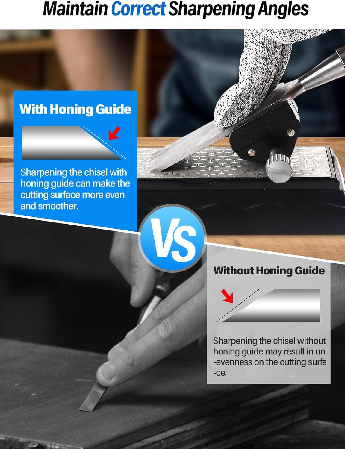 - √ Honing Guide & Angle Guide: Honing guide and angle guide tools help to accurate angle for different knife, can ensure precision knife sharpening. Whether you're a professional chef, woodworker, or DIY enthusiast, you'll appreciate the versatility and convenience of this sharpening stone set for chisels.