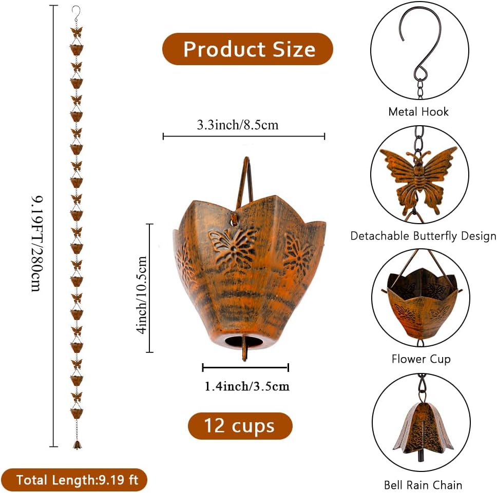 - Unique Design: The rain chain consists of 12 handmade lotus cups and butterfly decorations, connected by a metal chain in the middle. Hanging under the eaves, it effectively guides rainwater and decorate the house, brings excellent visual effects, making the house more elegant and beautiful. It can be used as an optional alternative to the traditional rain gutter system