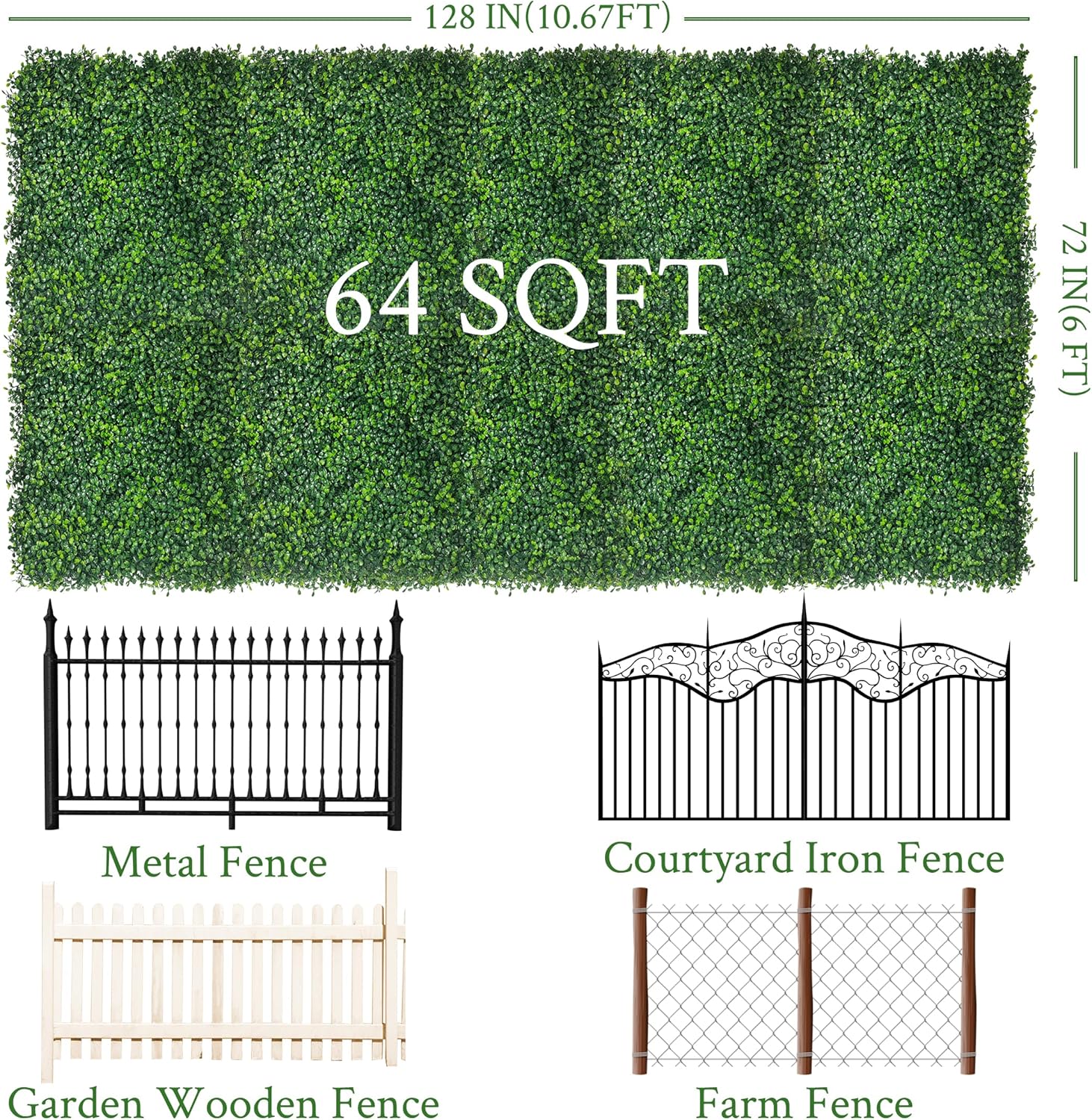 - Product Description:Each boxwood roll panel has 9216 fake leaves. Dense and realistic which can cover 64 square feet. 72 in * 128 in each. 2 in high.Have a 3D sense.Can be disassembled into small pieces or spliced into larger grass panels. Install anywhere you want to decorate.Create a vibrant atmosphere.