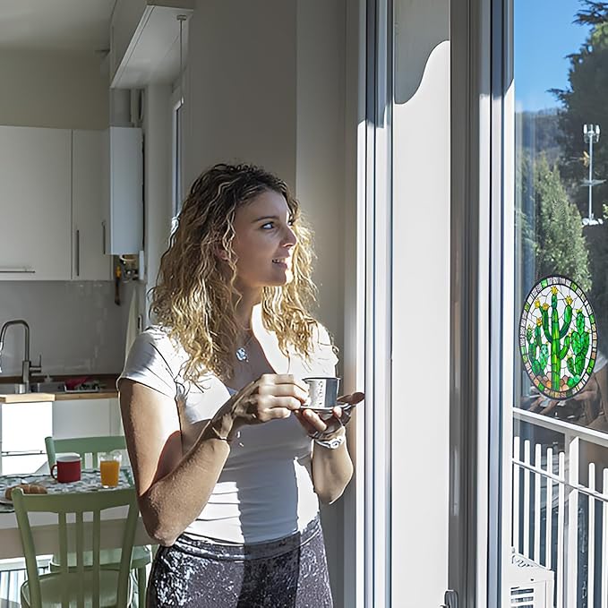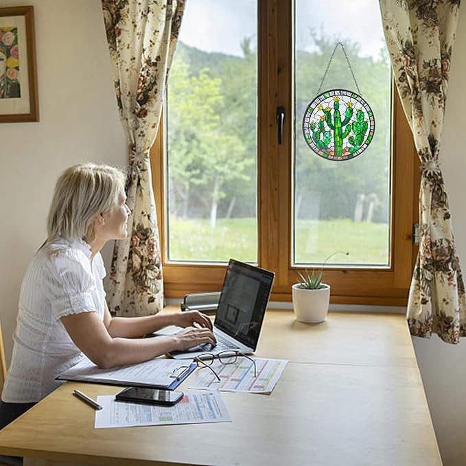 - 【stained Glass Window Hanging】This is a very beautiful cactus decor suncatcher with a size of 6x6 inches which is perfect for windows, adding a touch of color without obstructing the view outside. This piece of glass was cut individually and painted by hand. It is skillfully handmade, and it is real glass, NOT plastic or acrylic.