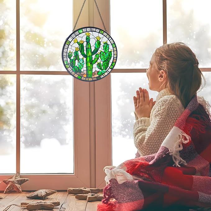 Cactus Decor Suncatcher Indoor/Outdoor Stained Glass Window Hanging - Handmade Stained Glass Suncatchers for Windows Hanging - Outdoor Garden Decor Gift for Women Christmas Thanksgiving Gifts