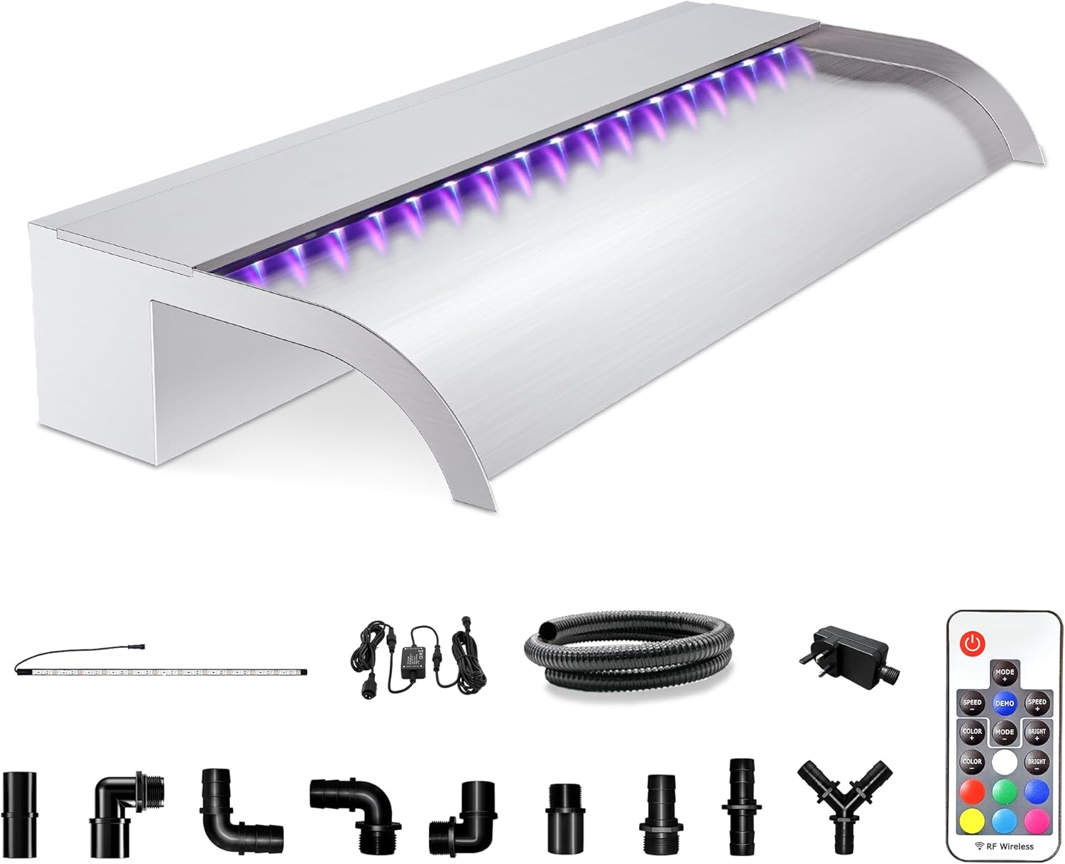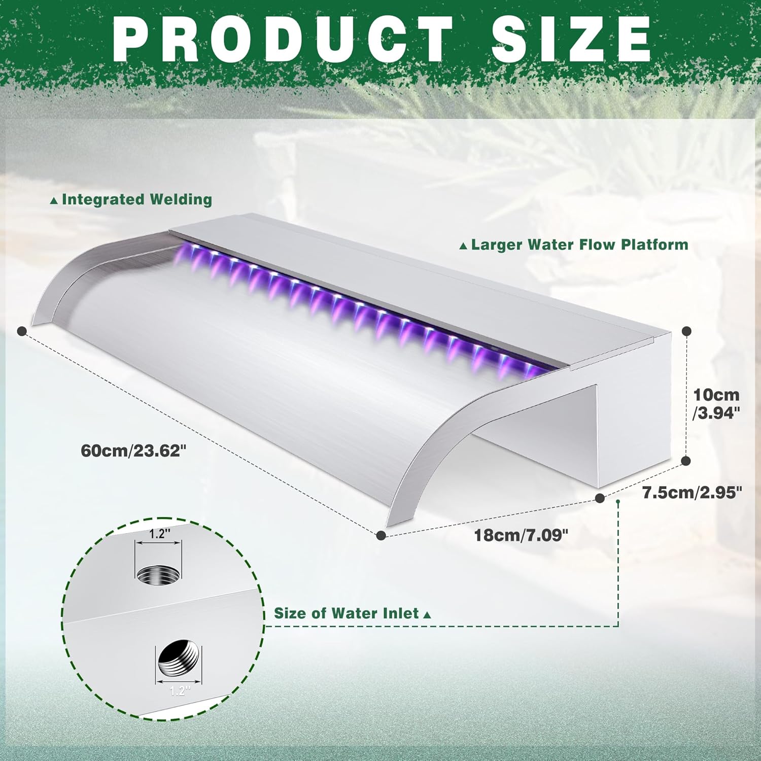- 【Stainless Steel Waterfall】 The main body of the stainless steel waterfall spillway is welded together using 304 stainless steel, providing durability for long-term use, ensuring rust-proof and no water leakage. The open lip design creates an elegant, invigorating freefalling water effect for your swimming pool or pond