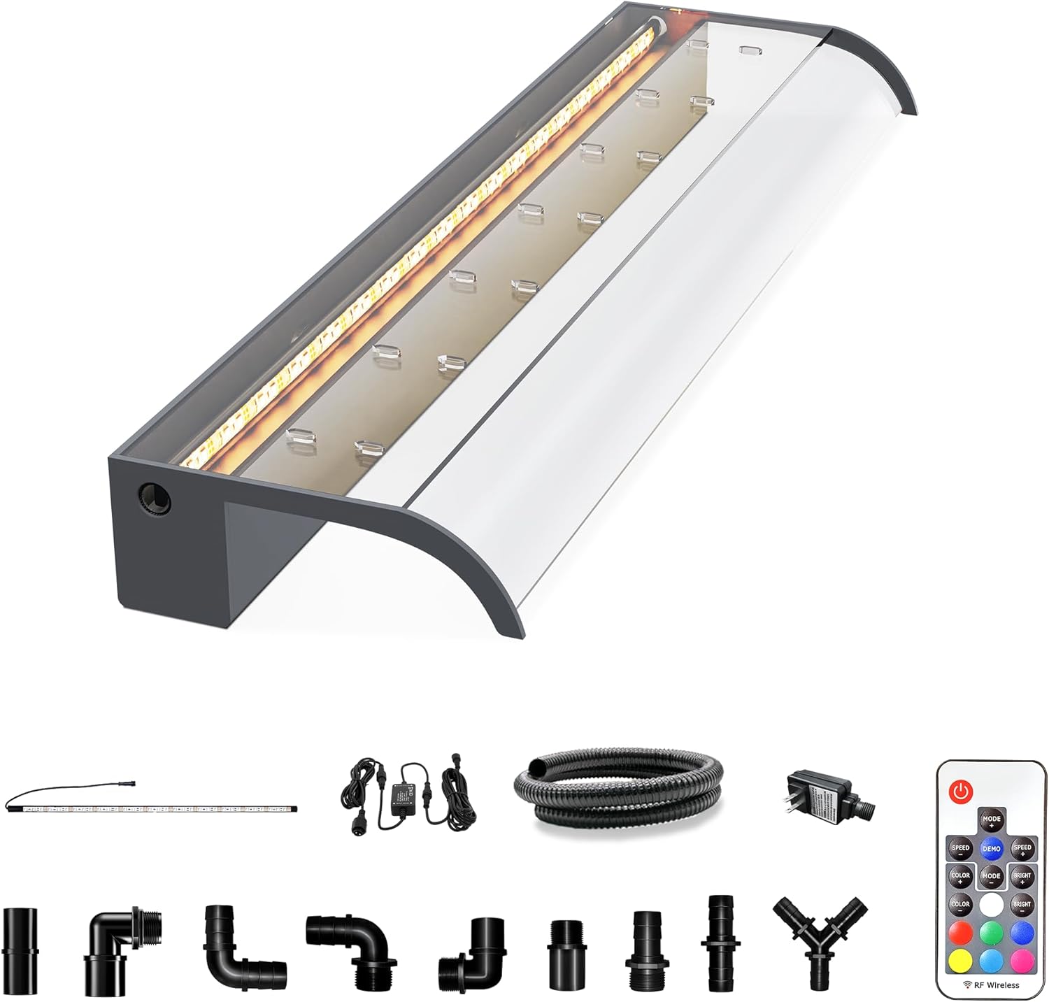 - 【Upgrade SMD LED】The upgraded IP68 waterproof SMD LED light strip will be brighter than ordinary light strips. It can be installed on movable covers or fixed behind waterfalls using double-sided tape, creating two different lighting effects. The color, brightness, and mode speed can be changed using the included RF remote