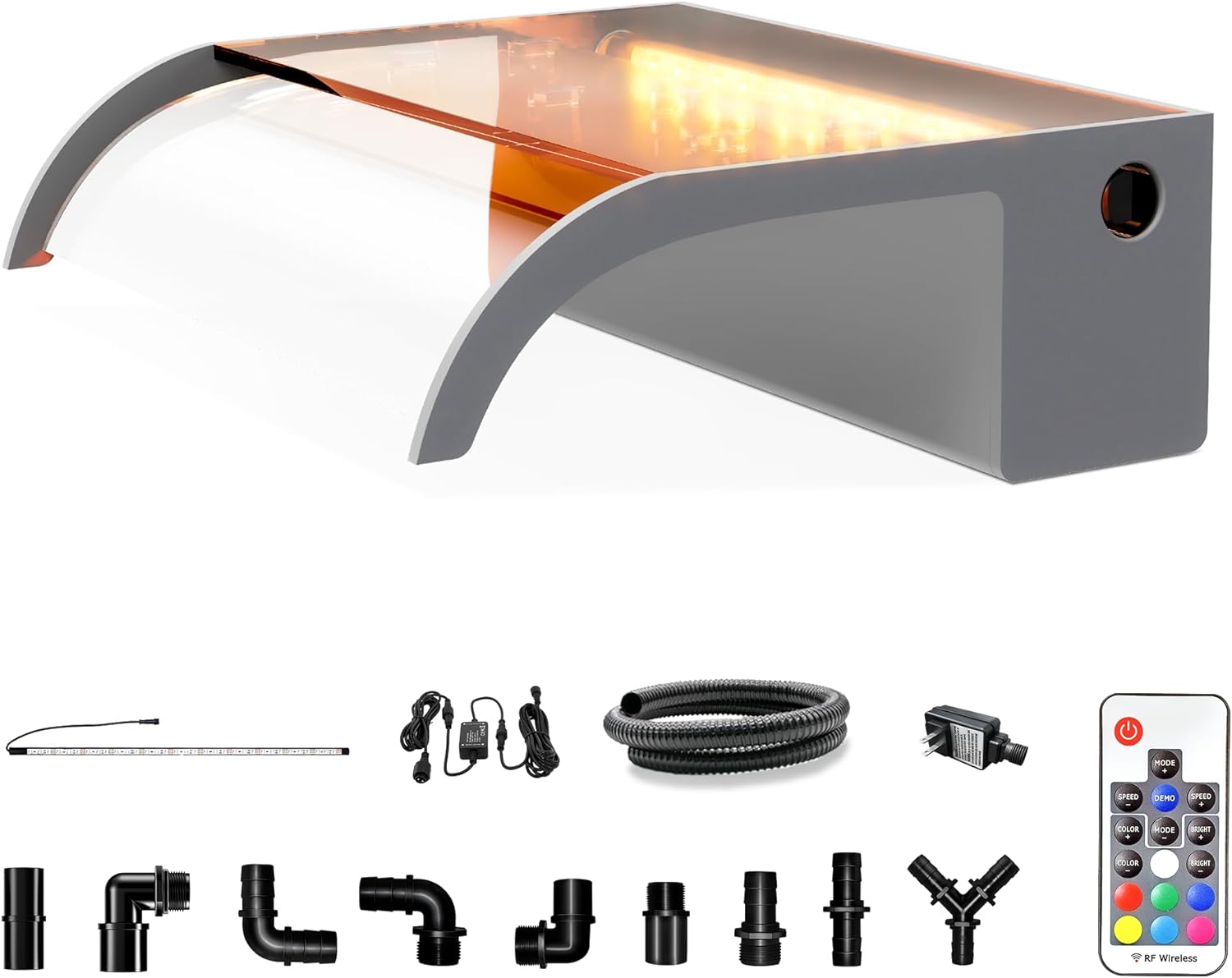 - 【DIY Decoration Pool & Pond fountain】LONGRUN waterfall spillway will make a decorative addition to your garden patio pond or swimming pool, it makes them more elegant, fashionable and beautiful. The color change of LED lights and the gentle sound of water running make your patio more special at night