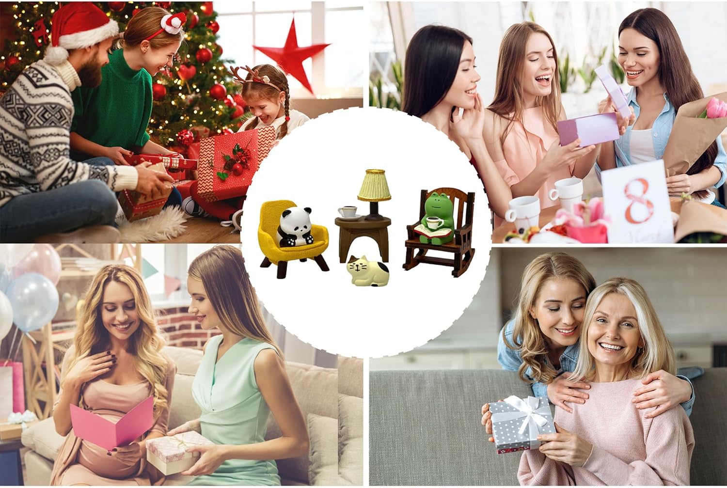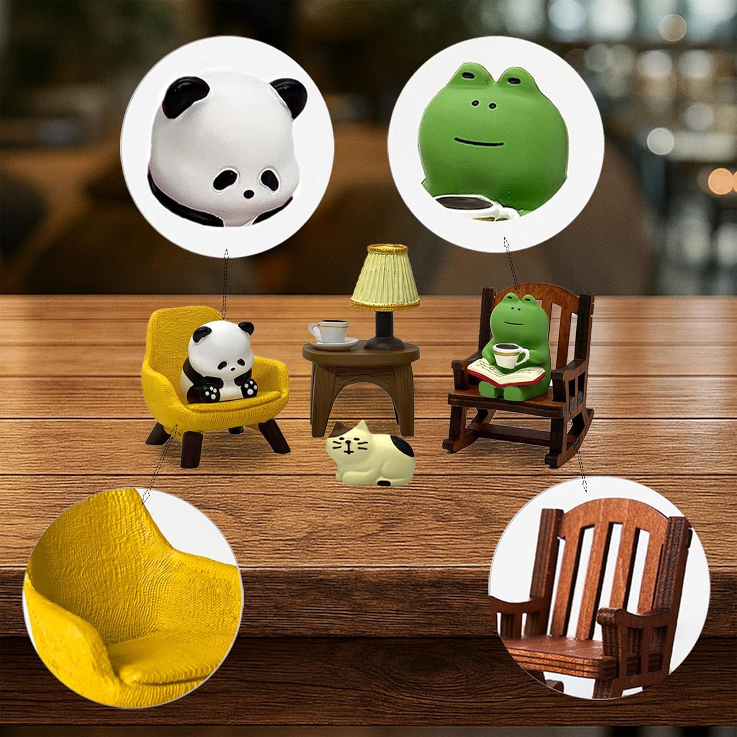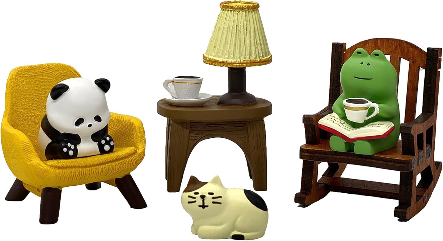 - Size and design: This set includes a frog sitting in a rocking chair enjoying coffee, a panda resting on the chair, and a desk with a table lamp and a cute cat statue. The design adds interest to your space and enhances your happiness