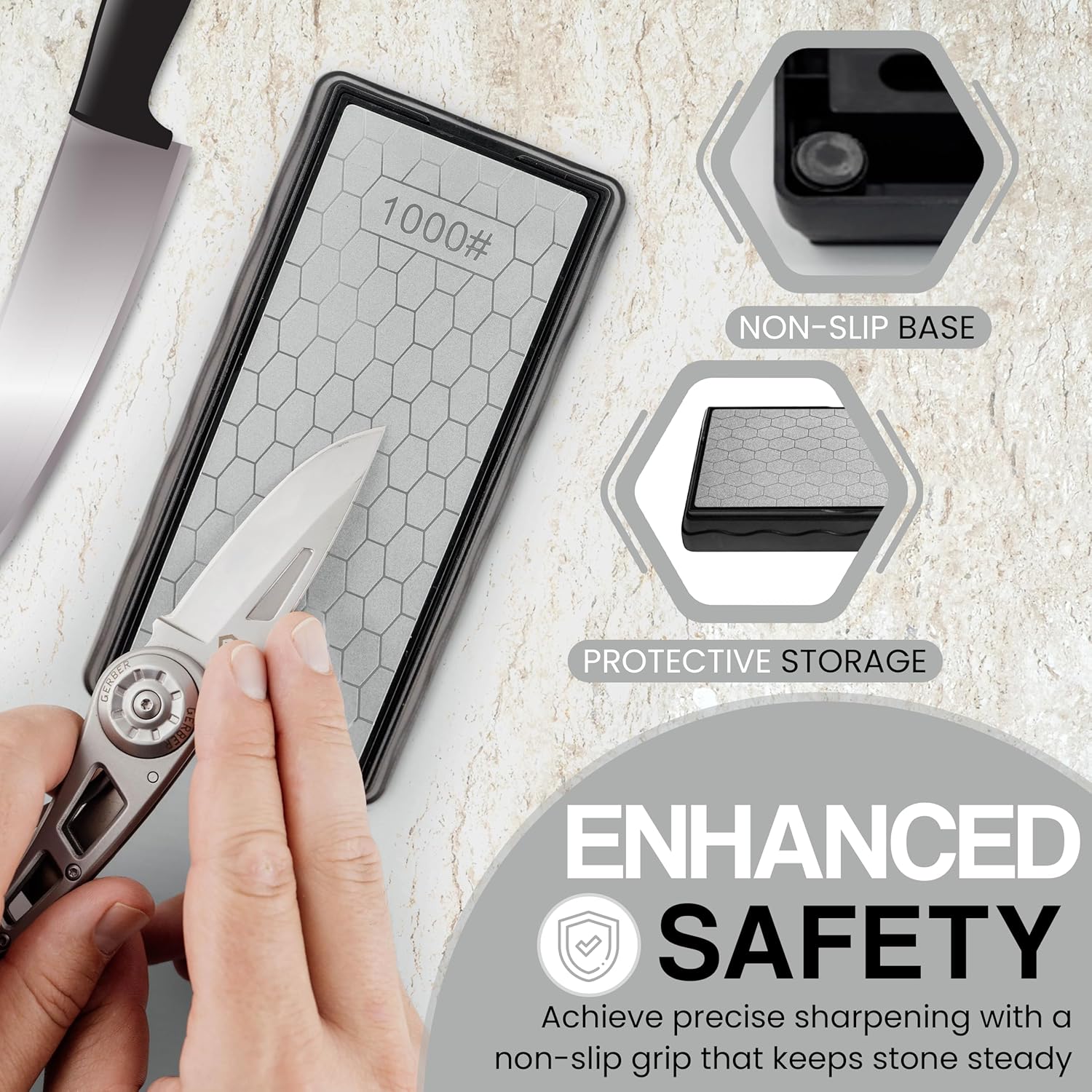 - ๐๐ง๐ก๐๐ง๐๐๐ ๐๐๐๐๐ญ๐ฒ ๐ฐ๐ข๐ญ๐ก ๐๐๐๐ฎ๐ซ๐ ๐๐ซ๐ข๐ฉ: Your safety matters! The non-slip, rubberized base keeps the diamond stone sharpener firmly in place, offering stability for worry-free use. No more slips or accidents, just secure, Also Protect your diamond knife sharpener with Protective Cover from damage and keep it clean with the included cover.