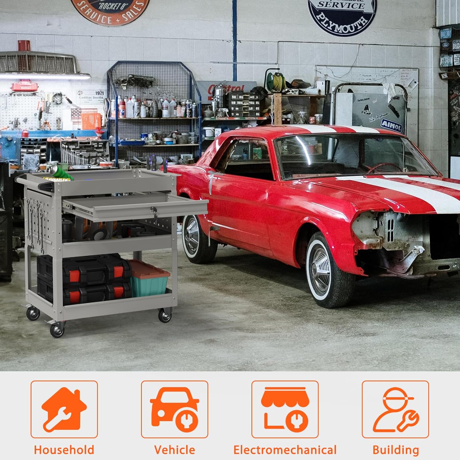 3-Tier Heavy Duty Utility Cart on Wheels, Rolling Tool Cart on Wheels with a Drawer, 350 Lbs Load Capacity Service Cart for Warehous, Garage and Repair Shop (Grey)