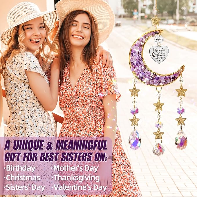 - PREMIUM MATERIAL & EXQUISITE CRAFTSMANSHIP: Birthday Gifts for Sisters from Sisters Crystal Suncatcher Wall Decor is handcrafted with a gold-plated crescent frame, inset with natural amethyst crushed stone, combined with exquisite AB stained glass, clear K9 crystal & prism beads, matched with shining gold-plated chains & start pendants, sturdy, cute, refined, sparkling & long-lasting. Once the light hits this crystal sun catcher, it will create beautiful reflections and cast fascinating rainbows