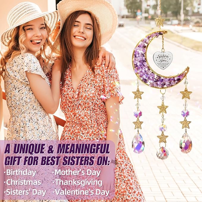 - PREMIUM MATERIAL & EXQUISITE CRAFTSMANSHIP: Birthday Gifts for Sisters from Sisters Crystal Suncatcher Wall Decor is handcrafted with a gold-plated crescent frame, inset with natural amethyst crushed stone, combined with exquisite AB stained glass, clear K9 crystal & prism beads, matched with shining gold-plated chains & start pendants, sturdy, cute, refined, sparkling & long-lasting. Once the light hits this crystal sun catcher, it will create beautiful reflections and cast fascinating rainbows