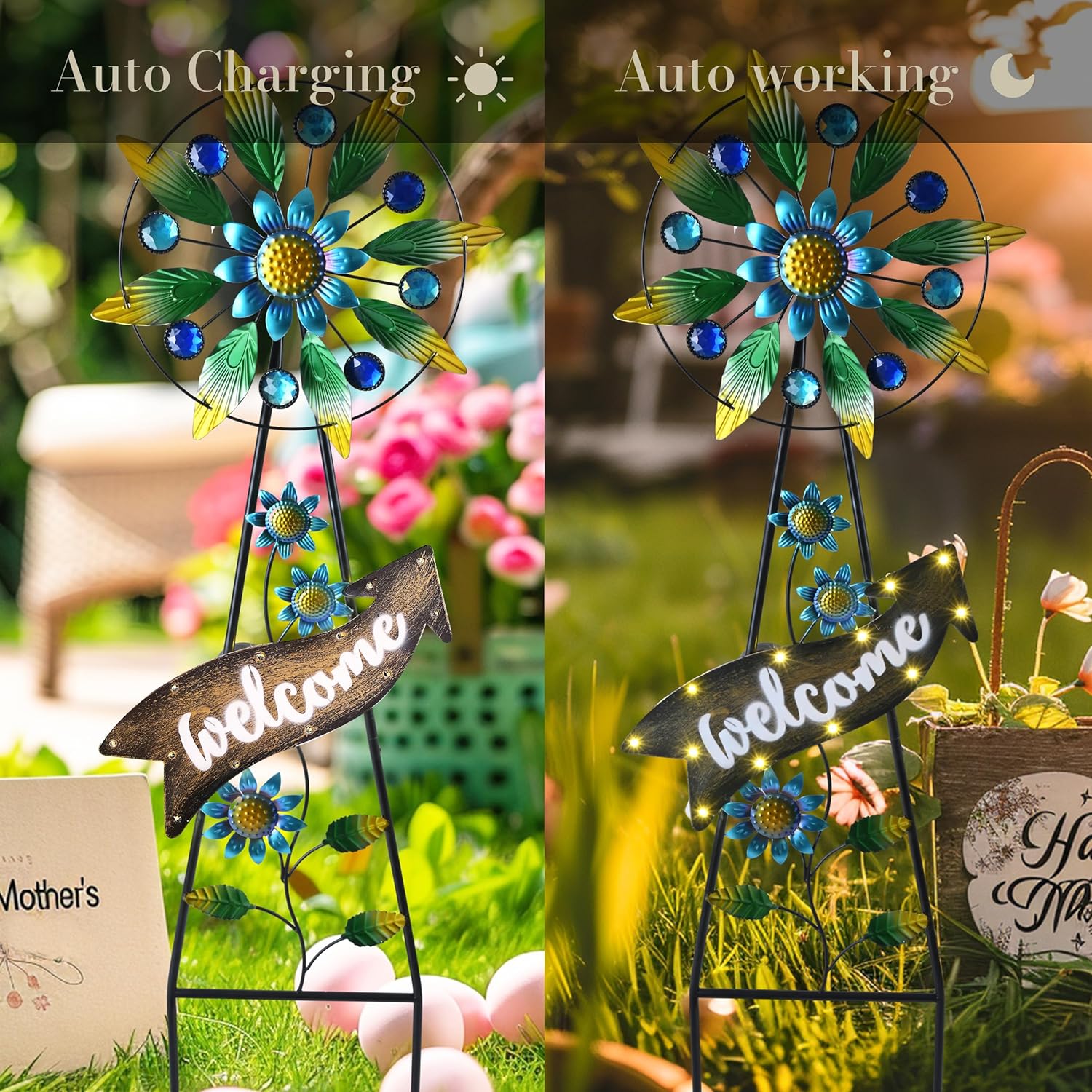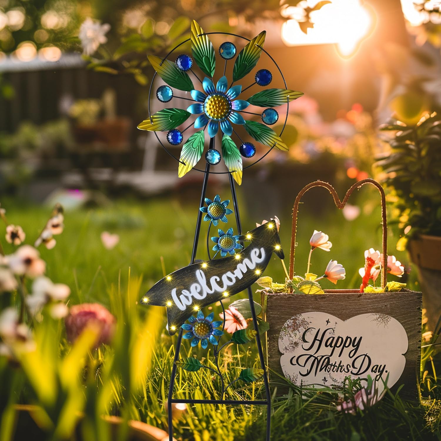 - 【Original Design】Featuring a stunning wind spinner in vibrant blue hues, embellished with sparkling purple gem accents, complemented by a rustic wooden "Welcome" sign and cascading floral accents, it adds an enchanting touch to any outdoor space.
