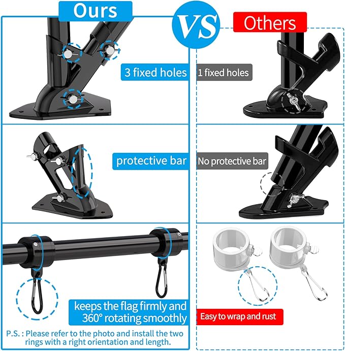 - Upgraded Bracket and Tangle Free Rings: The high strength aluminum alloy flag pole holder has unique protective bar and 3 fixed holes to make the two-position (90° and 45°) flag pole more stable. The two new designed flag rings and two sturdy carabiners, which could make the flag tangle-free in the wind. And Adjustable length swivel flag pole kit can be installed according to the different size flags.