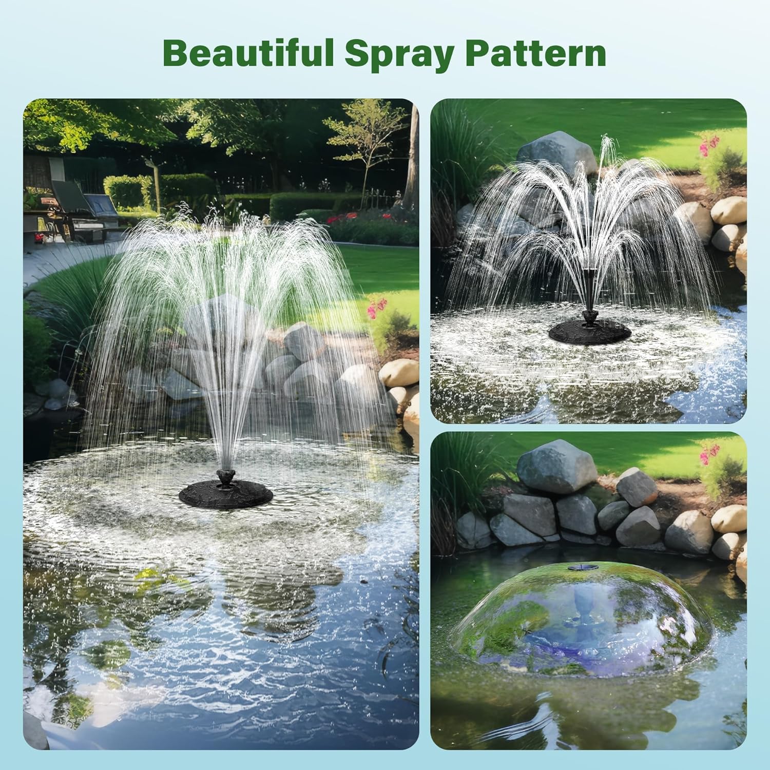 - Floating Fountain for Outdoor Ponds: Suitable for ponds, swimming pools and landscape fountains. Through 360° oxygenation spray, it can improve water quality and increase the oxygen content in the water
