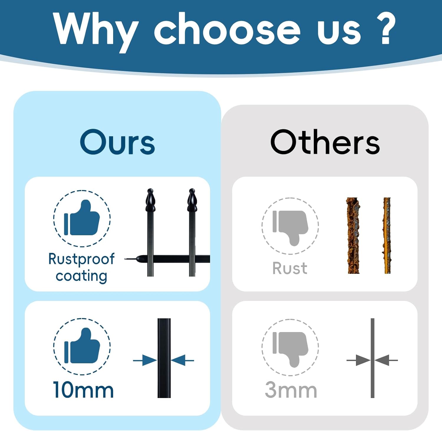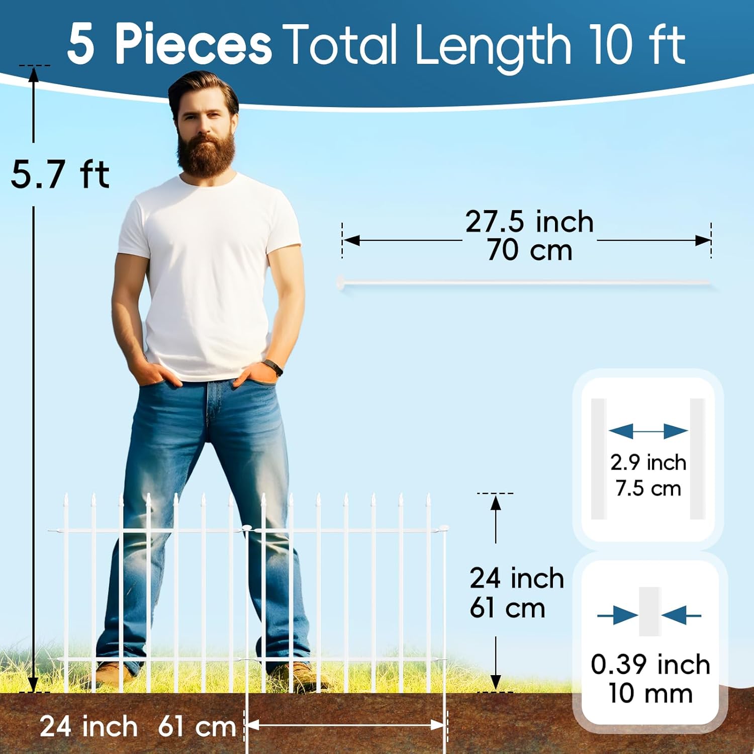 - 【Wide Range of Uses】Whether it's used to protect your garden or as a practical barrier at the border of your yard, this iron fence is perfect for the job. It can be used not only as a decorative fence, flowerbed fence, but also as a dog fence or animal fence to prevent animals from intruding into your garden or yard safely and securely. It can effectively divide your yard space, define private territory and skillfully avoid the invasion of small animals. This tall metal fence is versatile and can bring practical and aesthetic solutions to your outdoor life.