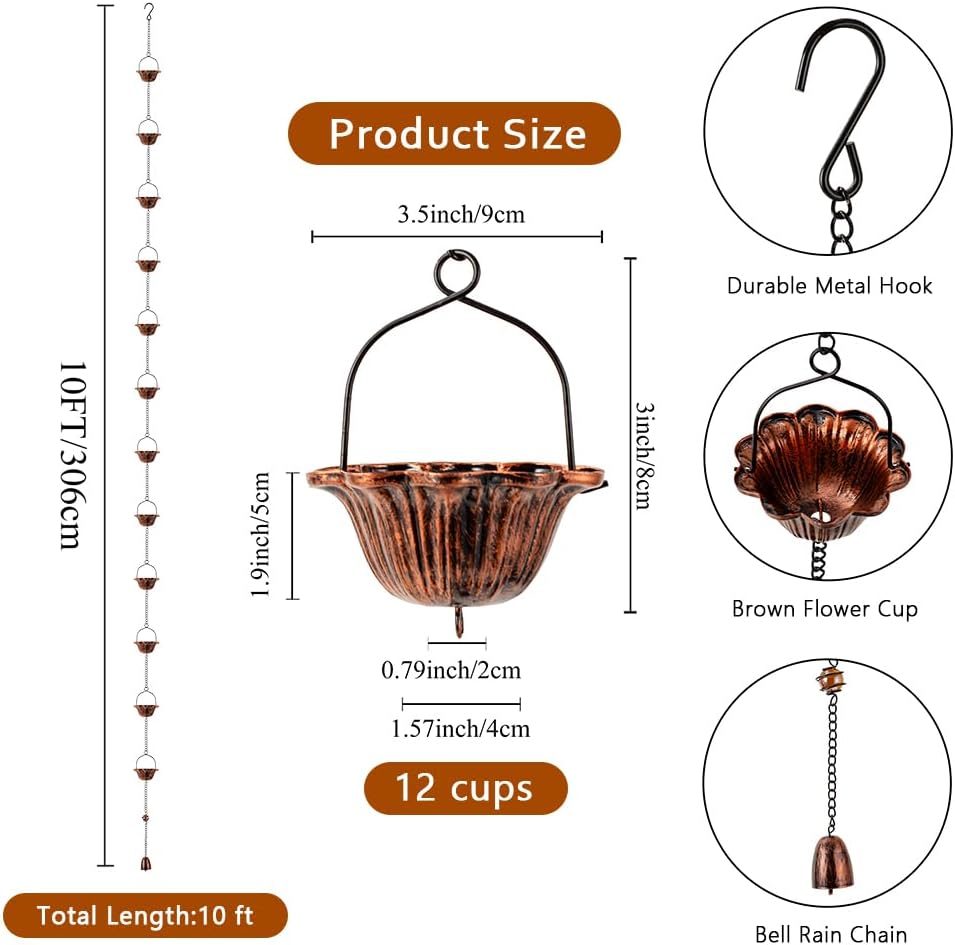 - Elegant Decoration: The rain chain for gutters is made up of 12 brown lotus cups, overall appearance is simple and rustic, with a cute bell at the end, adding a touch of charm to your house exterior whether it is sunny or rainy