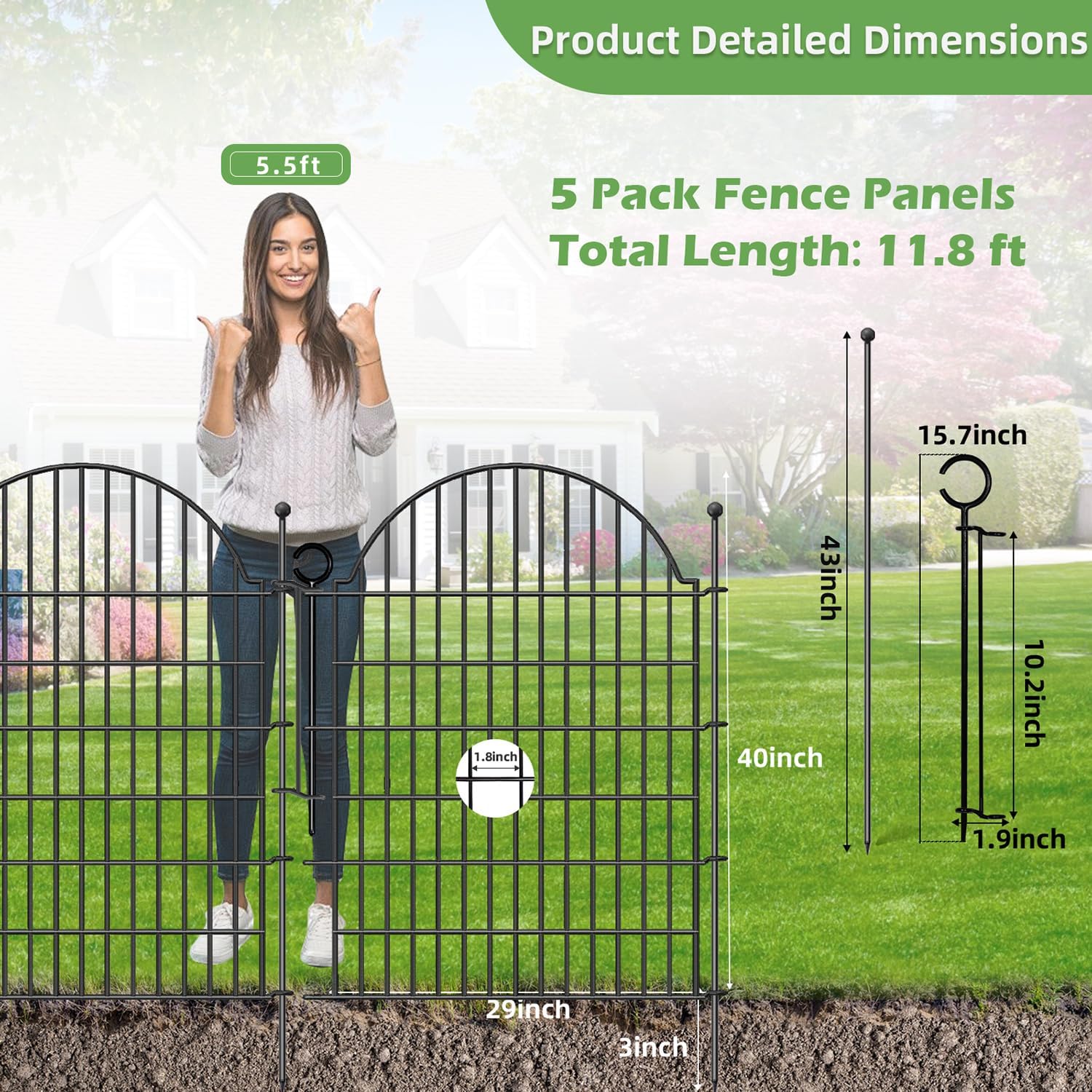 5 Panels Decorative Garden Fencing with Gate for Yard, 40in (H) x 11.8ft (L) No Dig Animal Barrier Fence, Rustproof Metal Wire Outdoor Dog Fences Panel Border with Temporary Ground Stakes