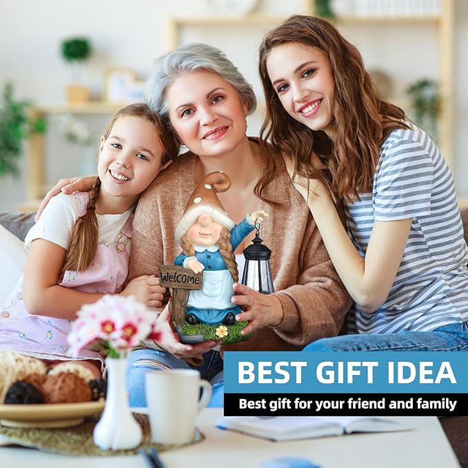 - Garden Gnome Decor: The gnome statue hold a welcome sign in its right hand and a solar-powered lantern in its left. The tall size of the gnome makes it stand out indoors and out; place it on your doorway, porch, or yard, and the big, cuddly gnome will warmly welcome every guest.