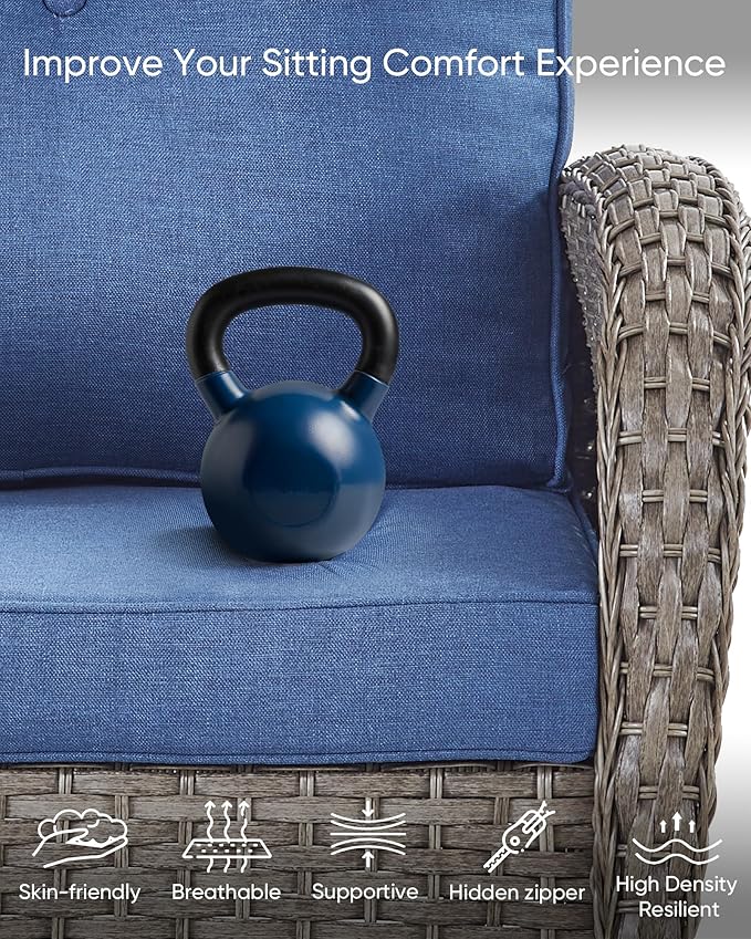- Thick Cushions for Lasting Comfort and Support: These 4-inch thick cushions are filled with high-density resilient sponge, providing excellent support and long-lasting comfort. The wide seating design ensures plenty of space to relax, while the cushions retain their shape and bounce back after each use, never compressing. Perfect for outdoor lounging, these cushions offer both softness and durability, giving you a superior seating experience for years to come.