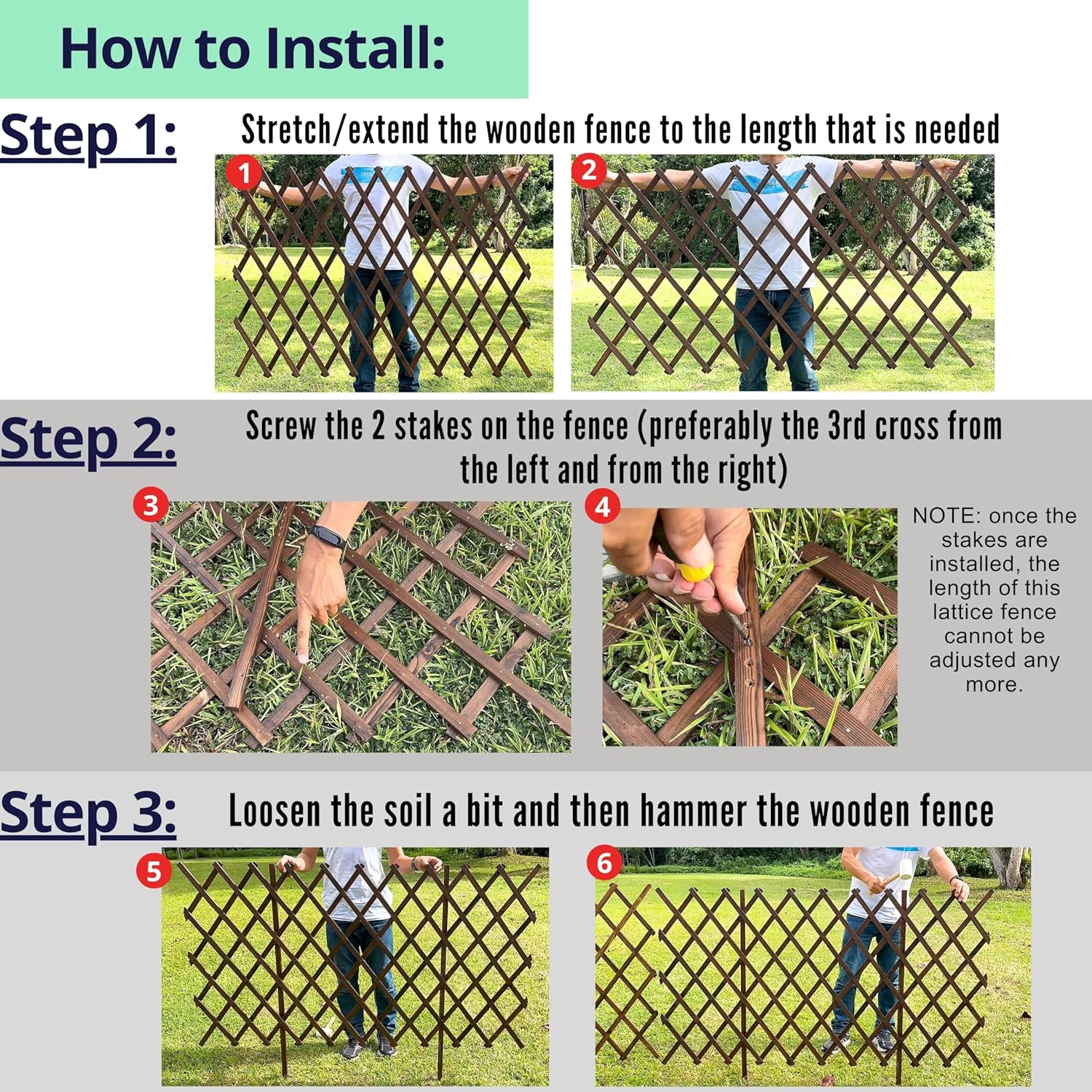 - EASY TO INSTALL: This garden fences and borders for dogs is designed for easy installation with following only 3 steps. Step 1: Strech/extend the wooden fence to the length that is needed. Step 2: Screw the stakes on the fence. (preferably the 3rd cross from the left and from the right) Step 3: Loosen the soil a bit and then hammer the wooden fence.