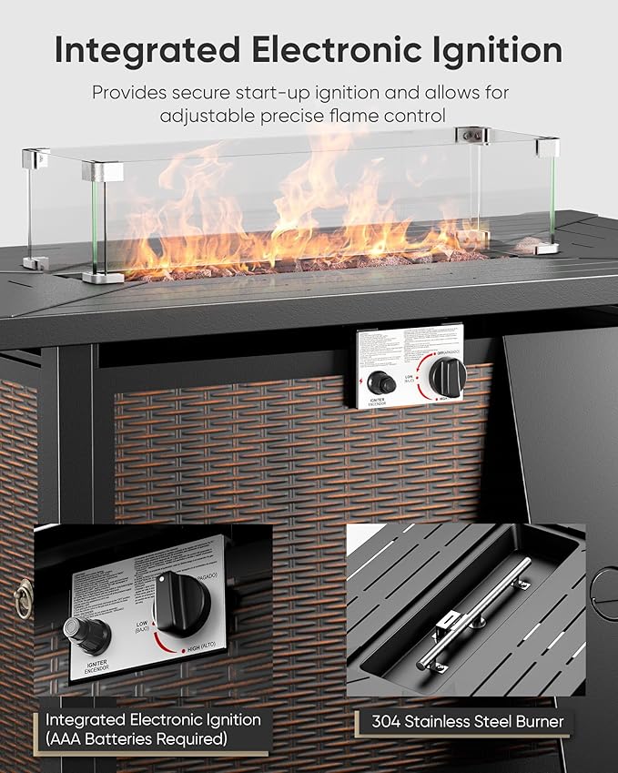 - Warm Bonfire and Auto-ignition Device:The gas fire pit table has a heat output of 50,000 BTUs and is equipped with an integrated electronic ignition that adjusts the flame to your desired temperature with the control button. Continuously provide you with enough warmth.