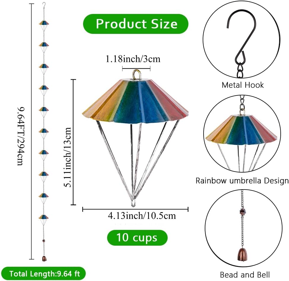 - Rainbow Rain Chains: This rainbow rain chain is made up of 10 rainbow parachutes, the total length is 9.7 FT/295 cm, this adjustable length rain chain is perfect for standard one-story buildings, you can adjust the length of the rain chain according to the height of your house. It will add a splash of color to your life and let you see a bright 'rainbow' even on a rainy day