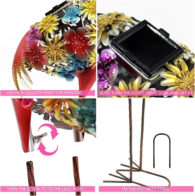 - Easy to Assemble: Our solar garden stake lights are very easy to install, no electricity required. This outdoor sculpture solar lights can withstand all kinds of weather, and stably work for a very long time in rainy days. The sculpture uses the U-shaped stake to prevent falling over, you can put some heavy stone on the feet, hold them in place even during severe wind gusts
