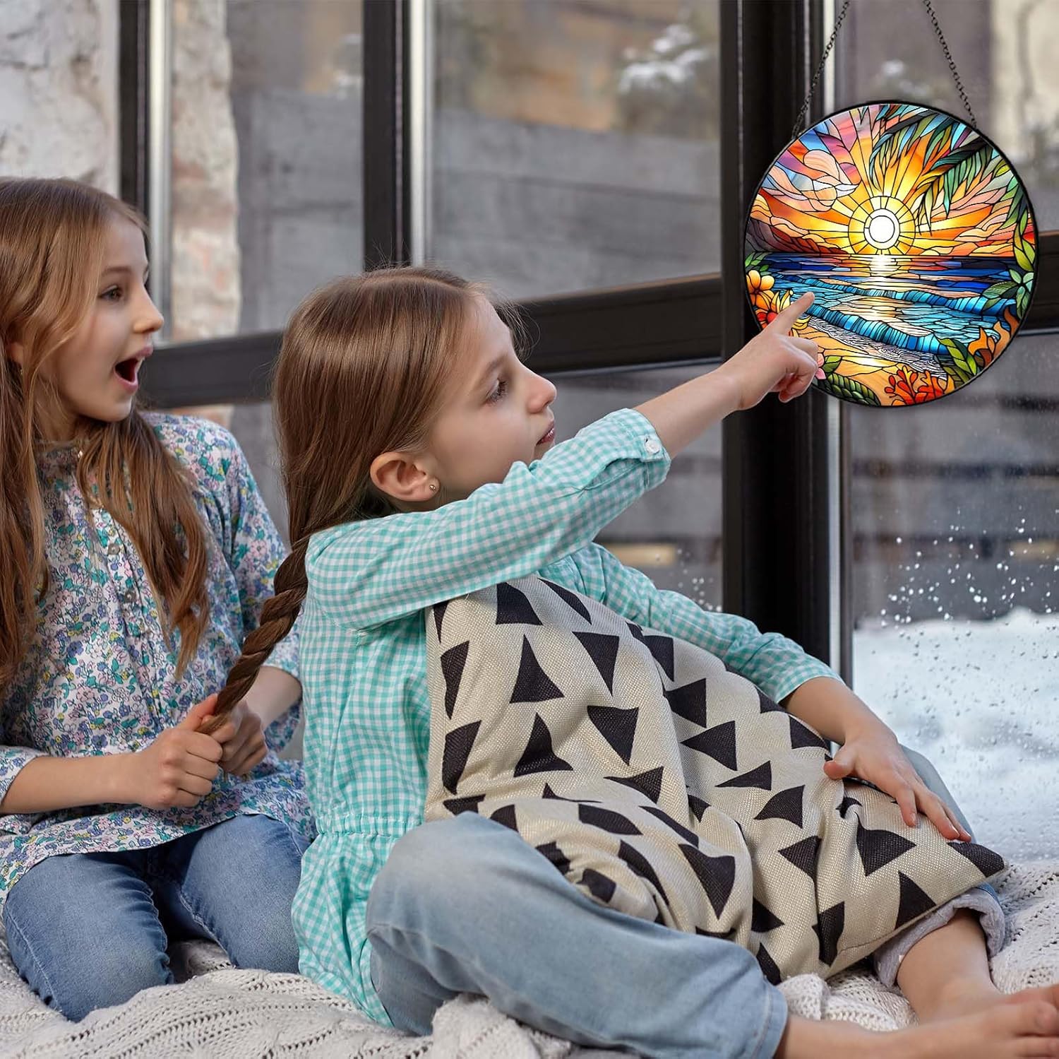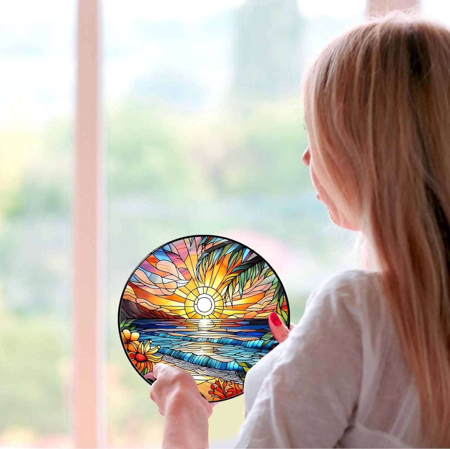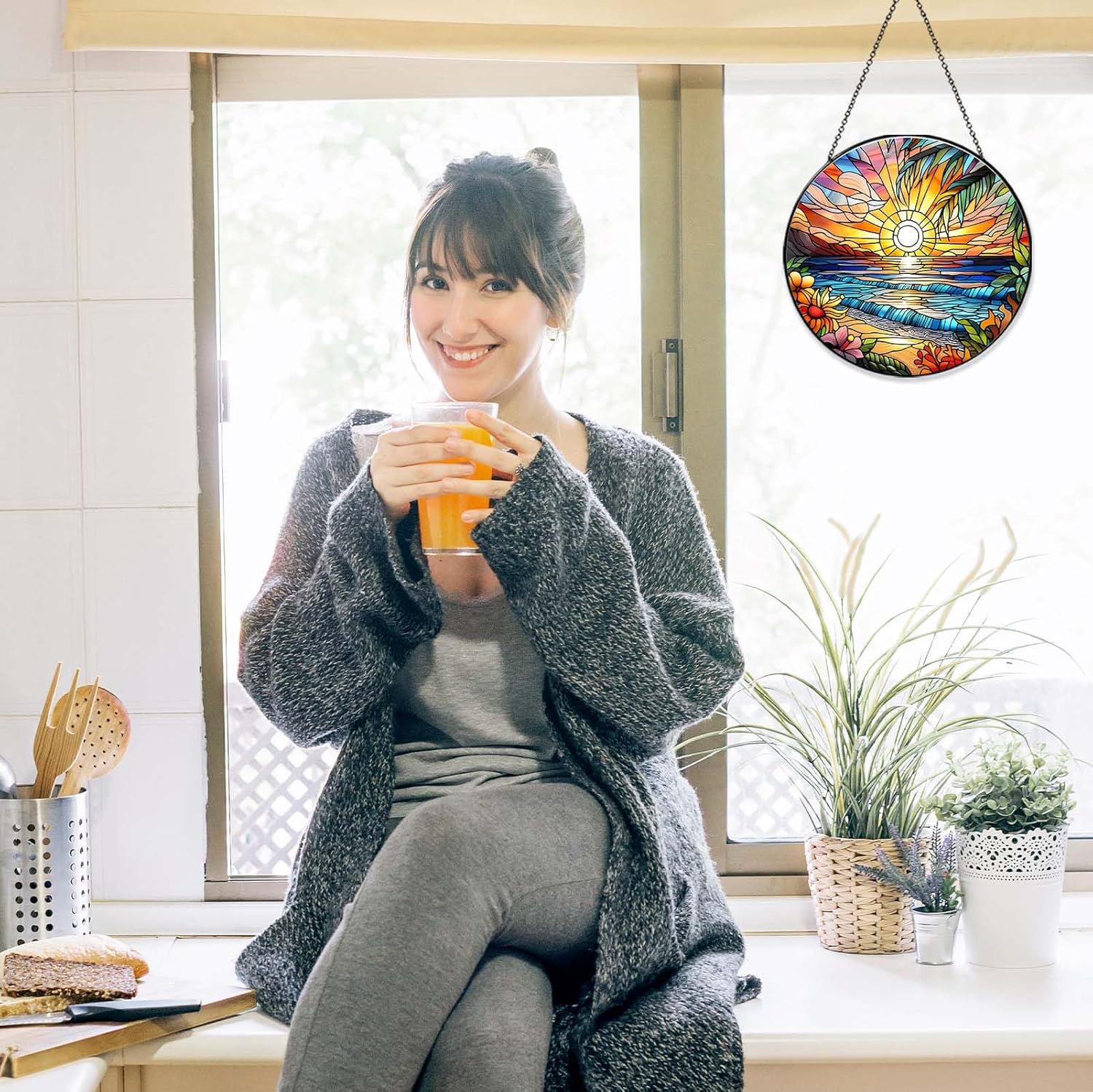 Beach Sunset Sun Catcher Stained Glass Window Hanging Beach Lovers Gifts for Women Wall Decor Landscape Decoration for Home Garden Housewarming Gifts