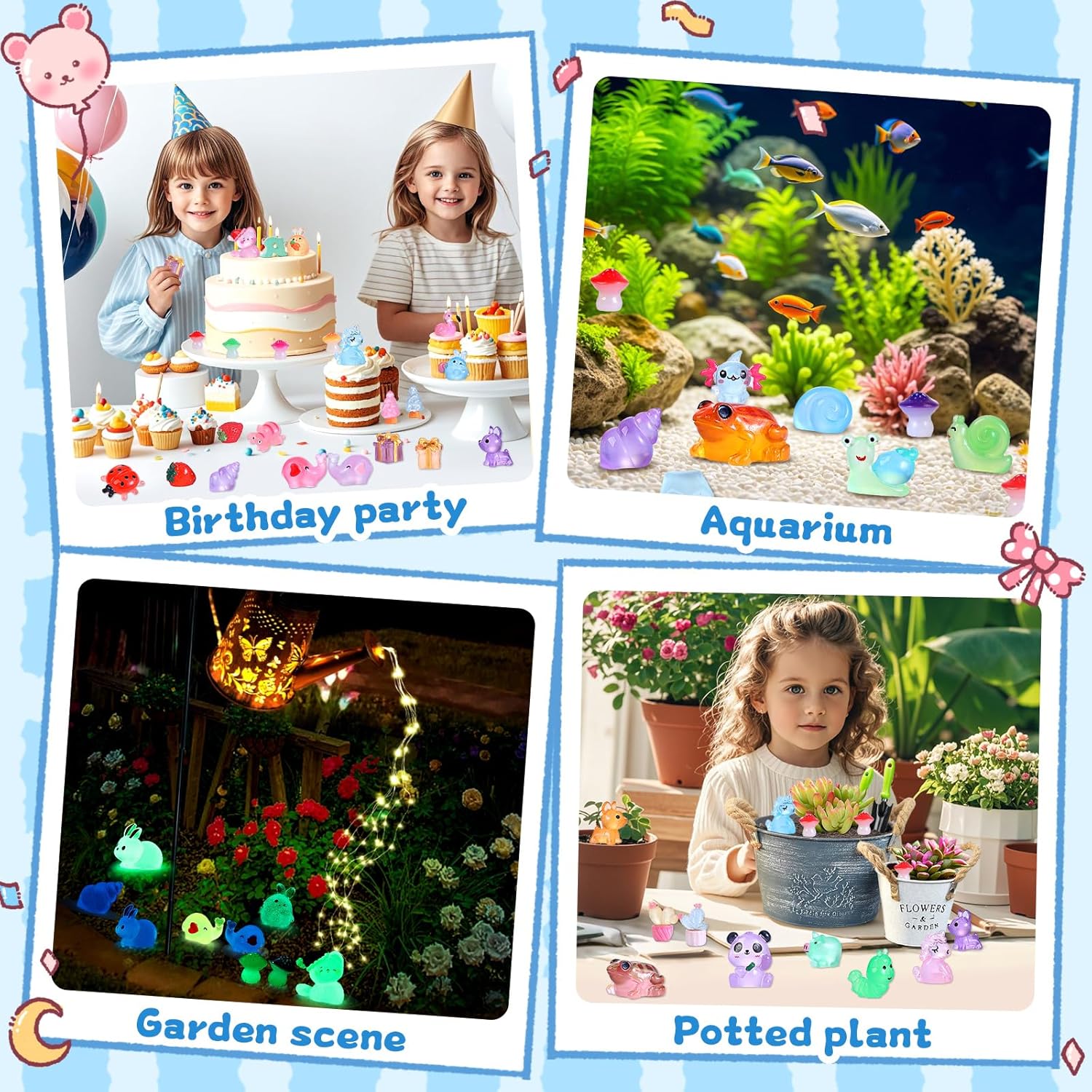 - Package Content:You will get 130pcs luminous tiny resin animals, including mini ducks, mini frogs, mini dinosaur figures, panda,chicken,lizards, bunnies, unicorns, flamingos, piglets, puppies, cat,snails, turtles, etc. Enough quantity will meet your diverse needs.