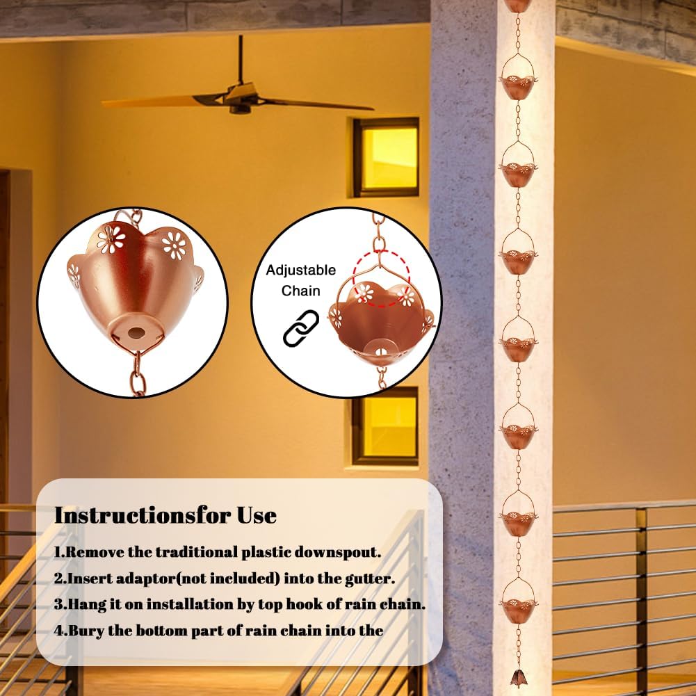 - Adjustable Rain Chain: The lotus rain chain is 8.2 inches long. The chain can be disassembled to shorten the length or assemble two rain chains to increase the length, which can be adjusted according to the height of your own house