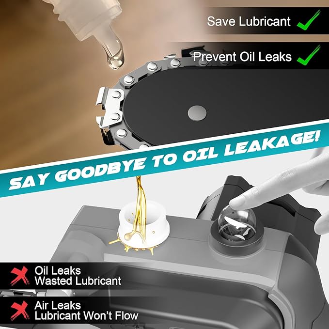 - No-Leak Oil Control & Clean Design: Tired of messy oil spills from other electric chainsaw models? This mini chainsaw’s patented press-to-lubricate system lets you apply oil in precise 0.1ml increments, with zero leakage during storage or use. Keep your toolbox and workspace clean—no more greasy hands or wasted lubricant. A game-changer for neat freaks and anyone who hates maintenance hassles.