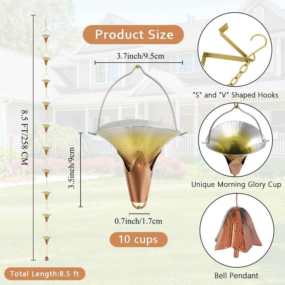 8.5 FT Rain Chain, Metal Rain Gutter Chains with 10 Morning Glory Shaped Cups, Adjustable Metal Rain Catcher Chain for Eaves Drainage, Replacement for Downspout