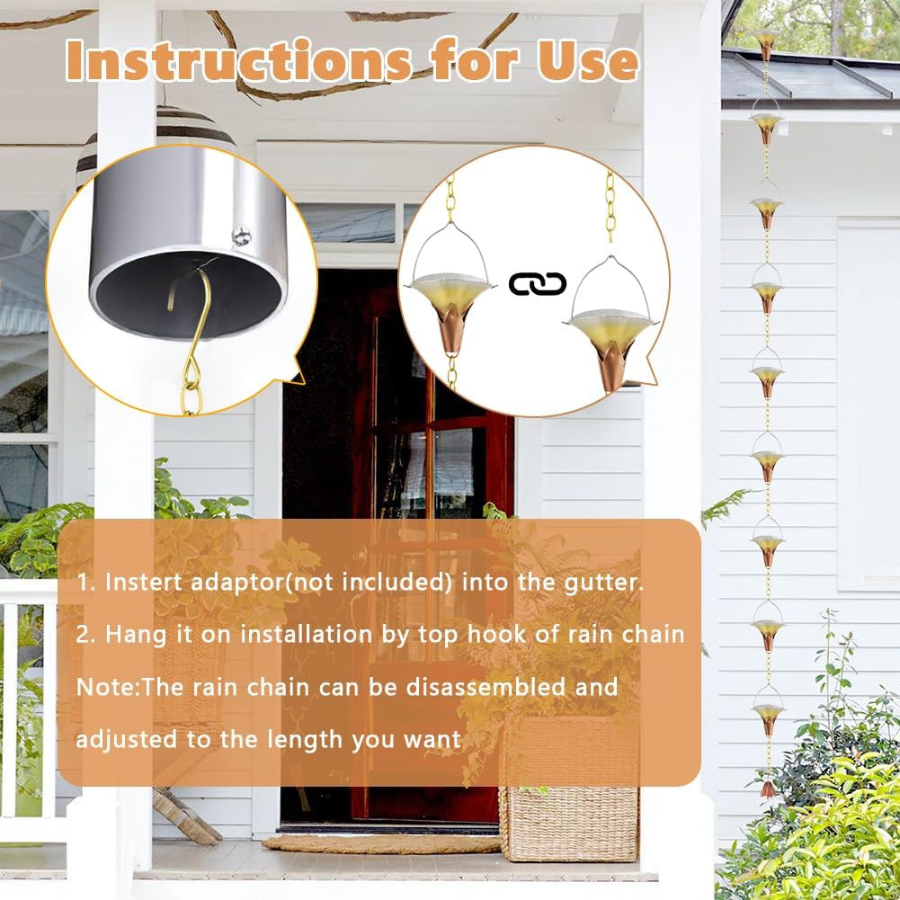 - Easy to Install and Use: No assembly required,the rain chain for outside is designed with "S" and " V" two shaped hooks, simply hang the hooks on the adapter, it can be used to hang under the eaves. The length of the rain chain is adjustable, if the rain chain is too long, can use a tool to remove the chain