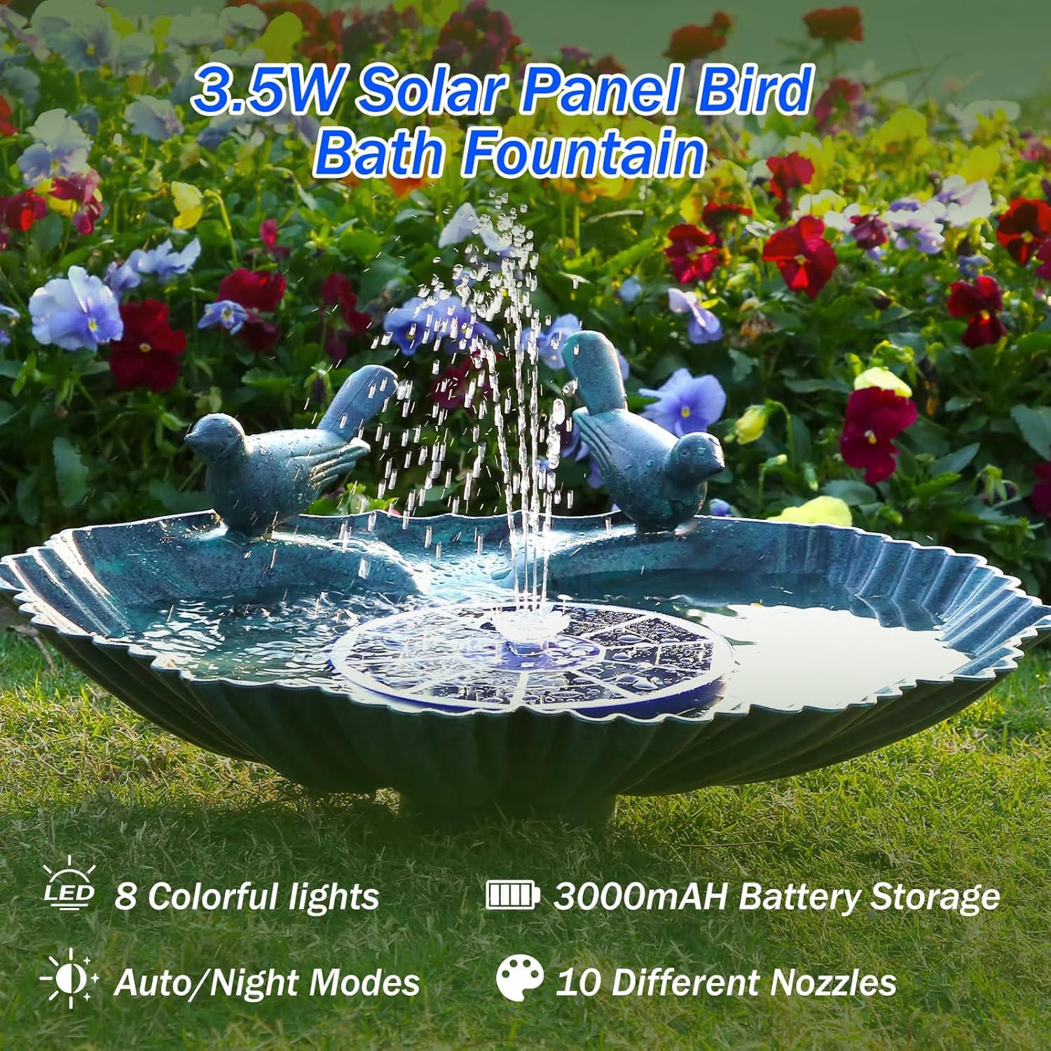 - 【10 Different Spray Styles】This bird bath fountain has 8 different nozzles, each nozzle has a unique spray style, you can change the nozzle according to your preference. This solar water fountain with lights is very suitable for birdbaths, fish tanks, ponds and garden, come and decorate your yard with solar power water fountain to make it more interesting!