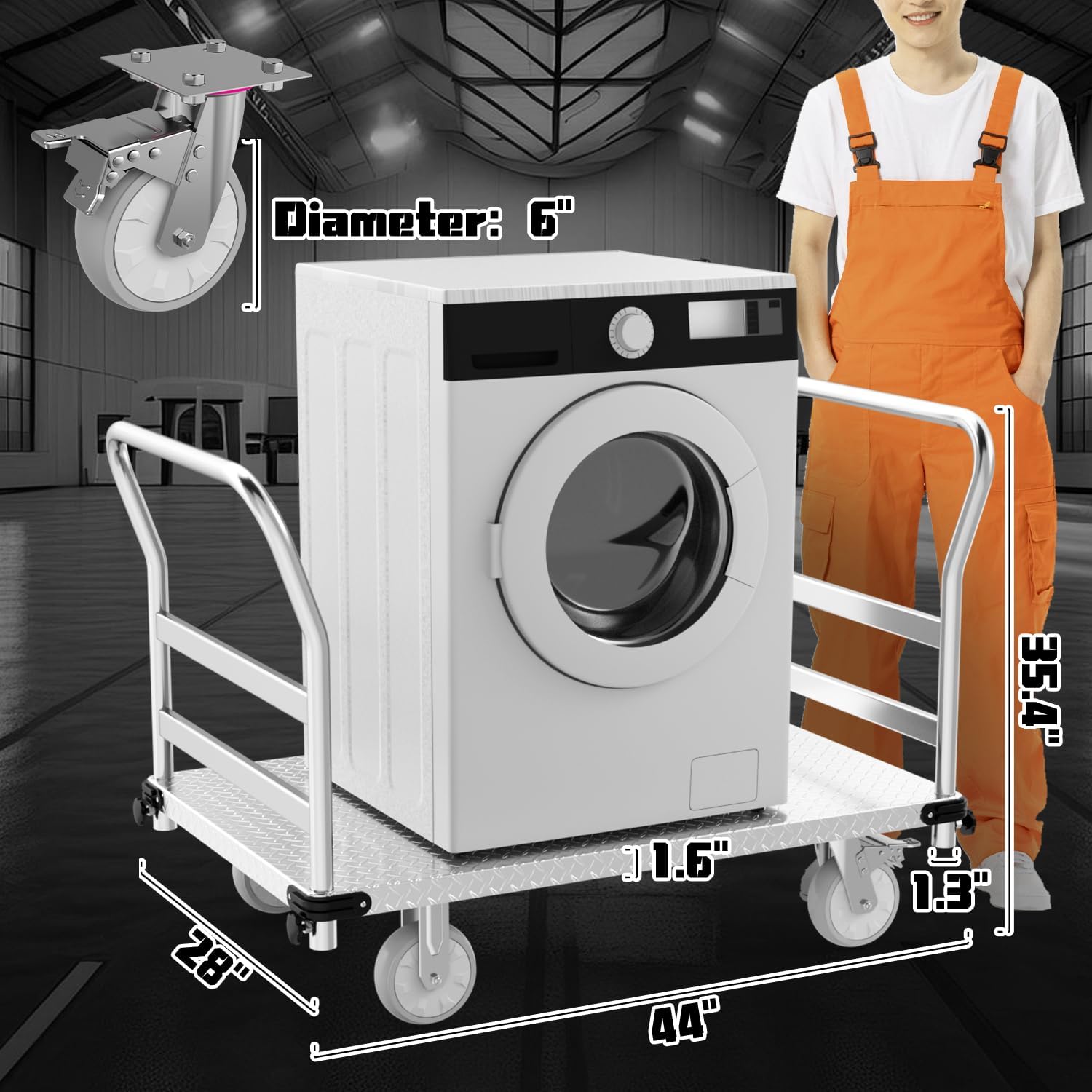 - 【🚚 44"x28" Extra-Large & 3,000lbs Industrial Capacity】 Designed for mega-scale logistics, this heavy duty platform truck features a 44"L x 28"W expanded workspace to haul full pallets, machinery, and oversized furniture. Reinforced square-tube frame + cross-braced chassis distributes 3,000lbs loads safely, ideal for port logistics, overseas warehouses, and industrial material handling.