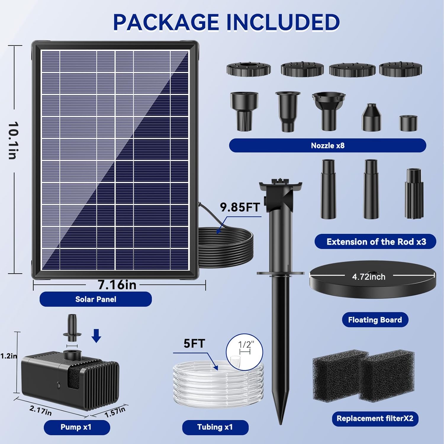 - ⛲8 Water Sprays & 5ft Tubing: Solar powered fountain with double-layer nozzle design, equipped with 8 different shapes of nozzles, creating a variety of fascinating water shapes, suitable for different scenarios. Solar fountain pump bird bath with 5 feet long PVC water pipe, flexible and durable, adapt to a variety of installation environments, easy for you to freely lay out the location of the fountain